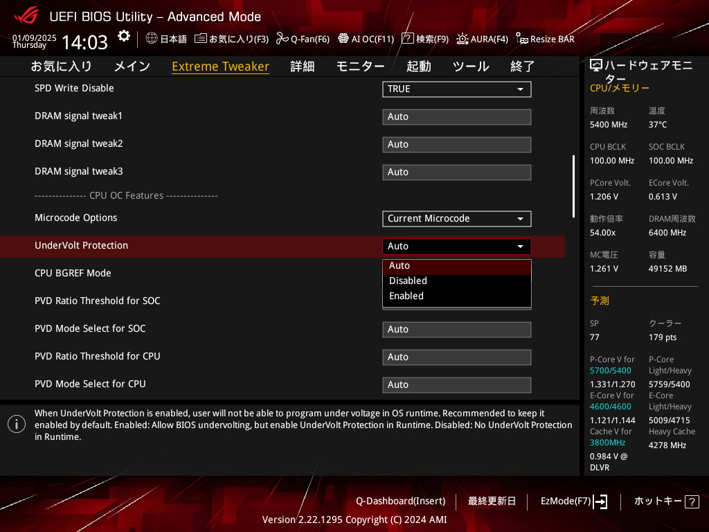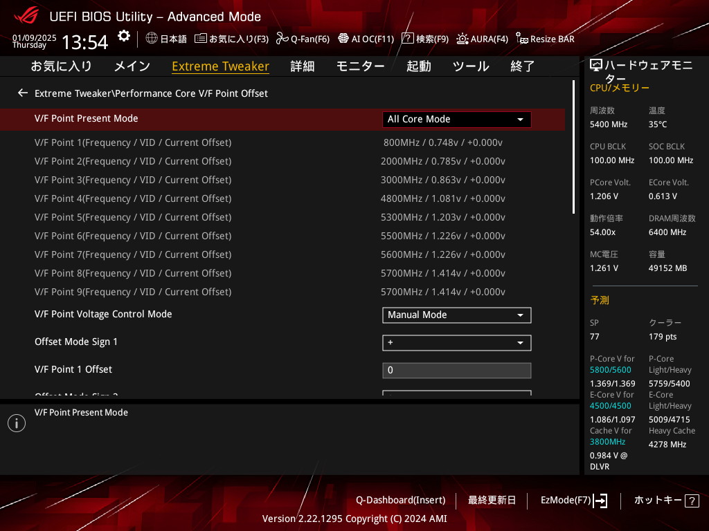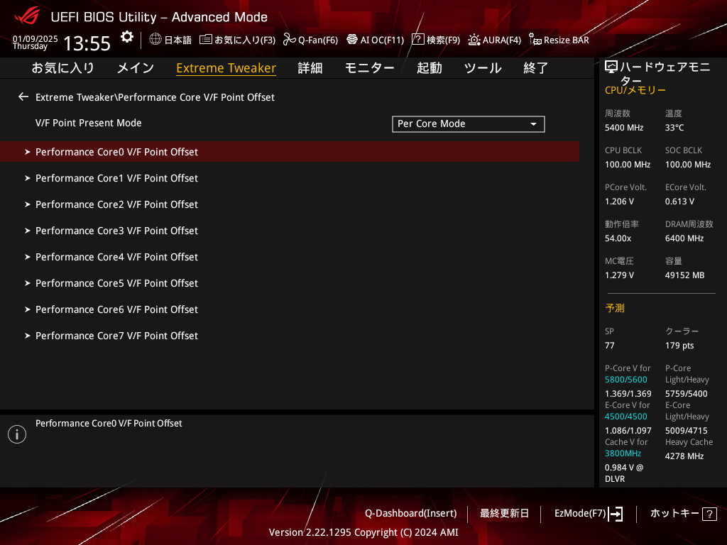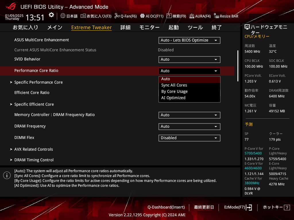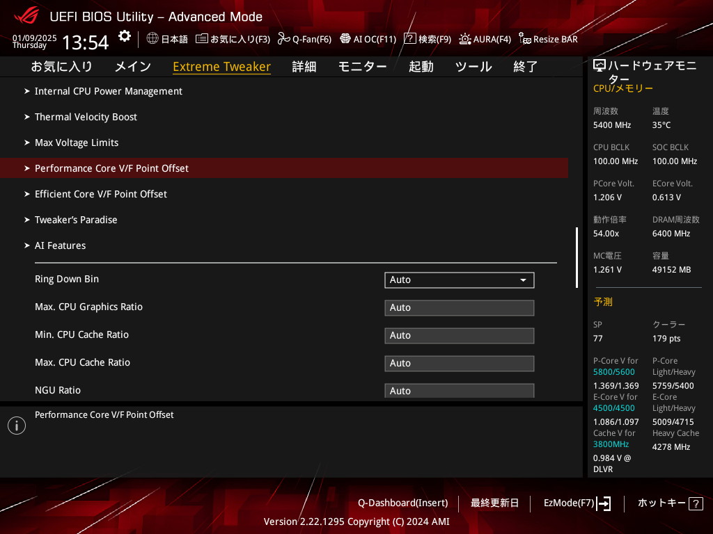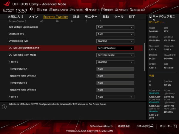 メモリOC設定については検証機材メモリ「Crucial DDR5 Pro OC 6400MHz(CP2K16G64C38U5B)」に収録されたOCプロファイルを適用し、メモリ周波数 6400MHz、メモリタイミング CL38-40-40-84、メモリ電圧1.350Vです。