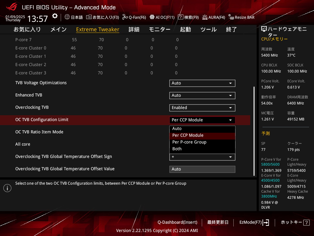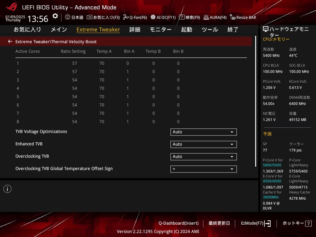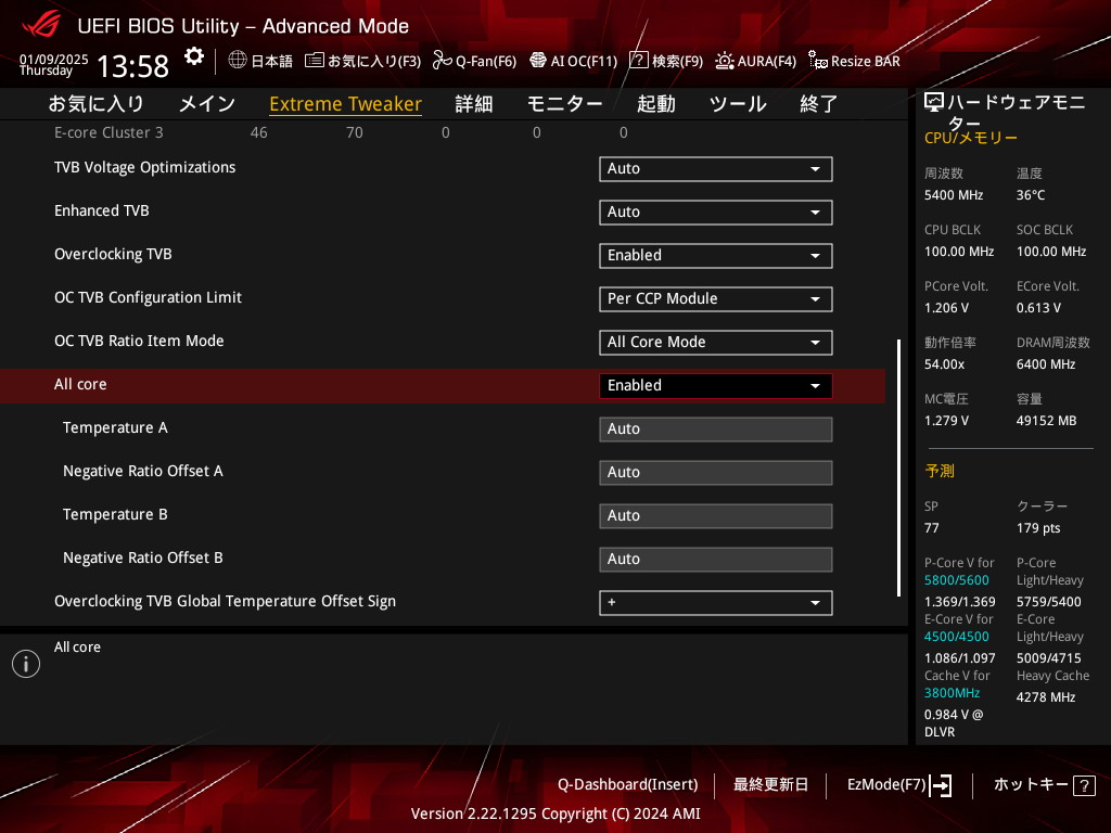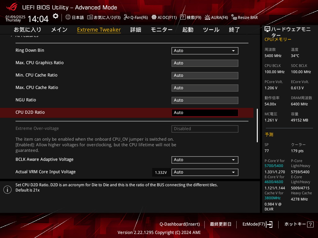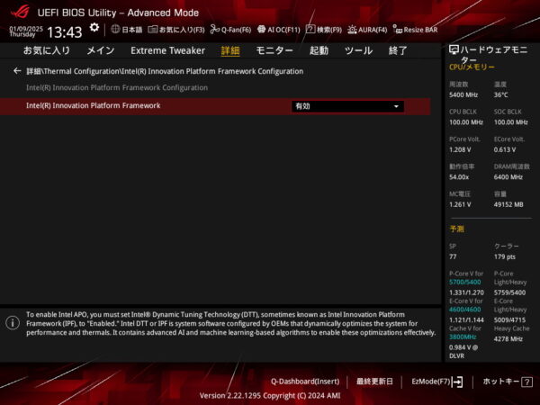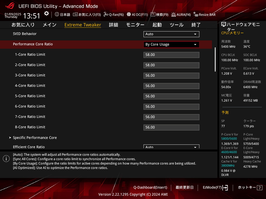 メモリOC設定については検証機材メモリ「Crucial DDR5 Pro OC 6400MHz(CP2K16G64C38U5B)」に収録されたOCプロファイルを適用し、メモリ周波数 6400MHz、メモリタイミング CL38-40-40-84、メモリ電圧1.350Vです。