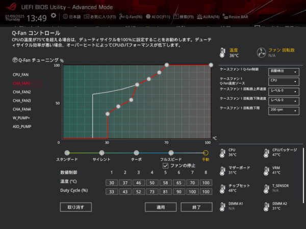 CPUクーラーにはFractal Design Celsius S36を使用し、冷却ファンNoctua NF-A12x25 PWのファン回転数は1500RPMで固定しています。