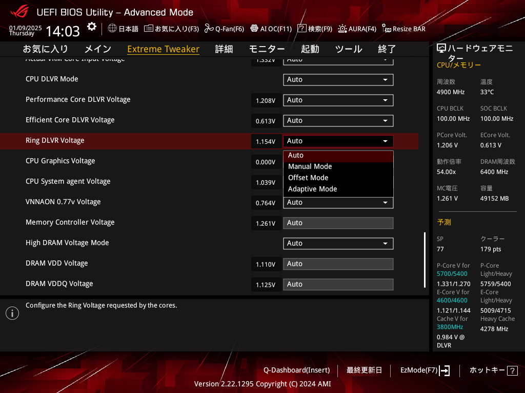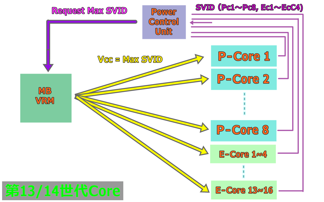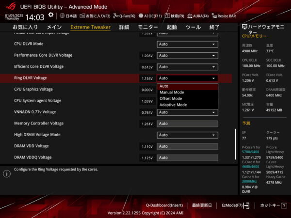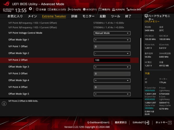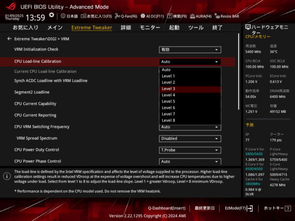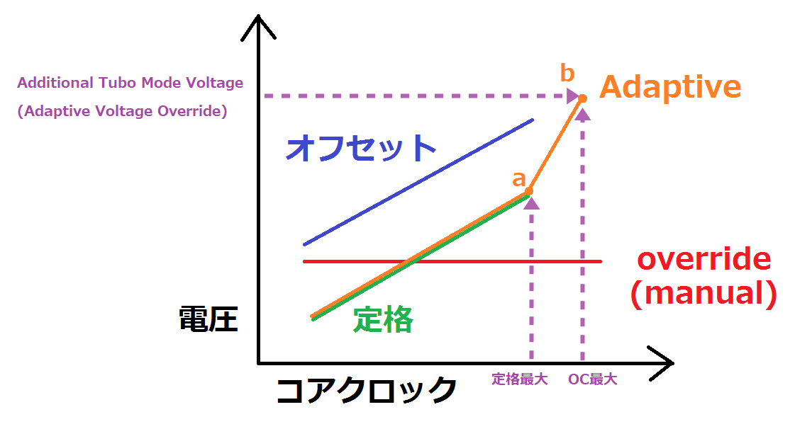 0.00~2.00の範囲内で設定し、定格設定は1.00です。1.00以下では低電圧化、1.00以上では高電圧化します。(マザーボードに依っては128を基準に0~255の整数値で設定)
