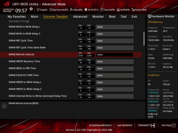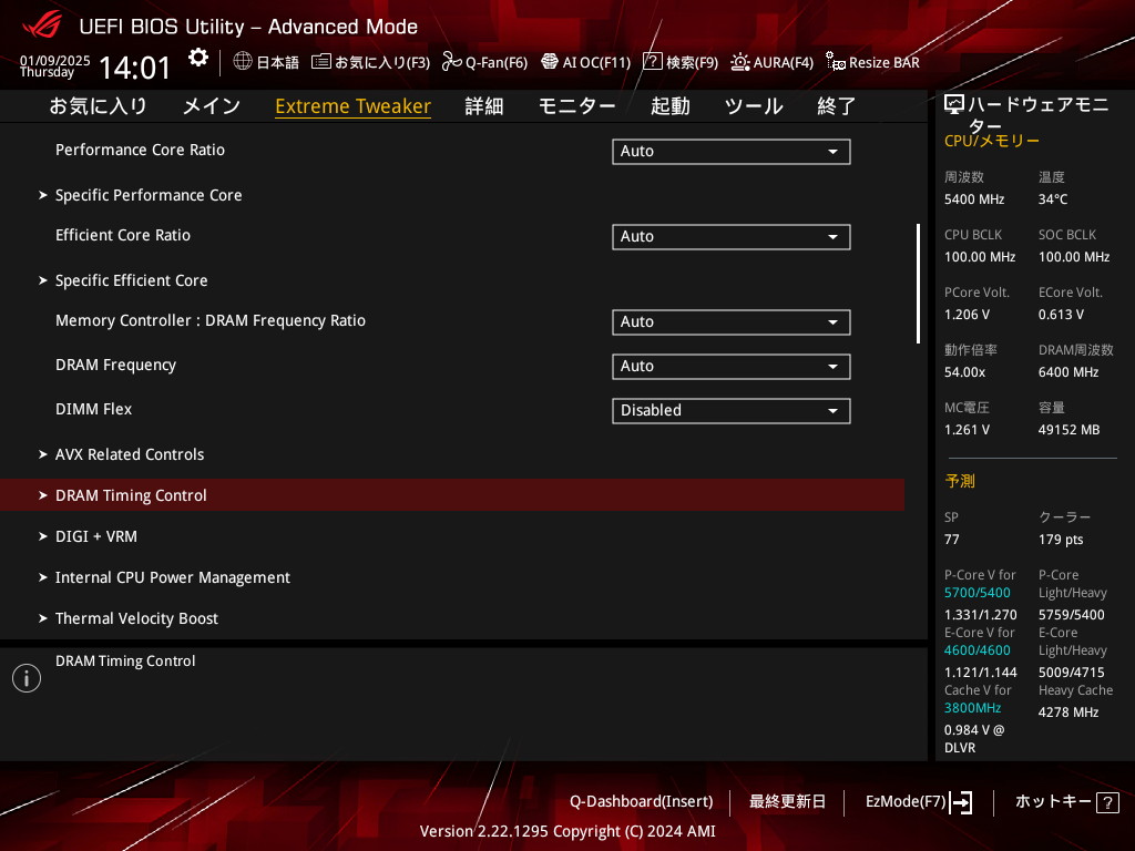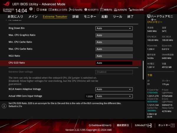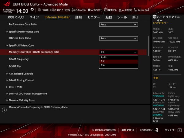 同メモリに収録されたOCプロファイルを適用するだけで、メモリ周波数 6400MHz、メモリタイミング 38-40-40-84が安定動作しました。メモリコントローラー周波数UCLKも1:2同期です。