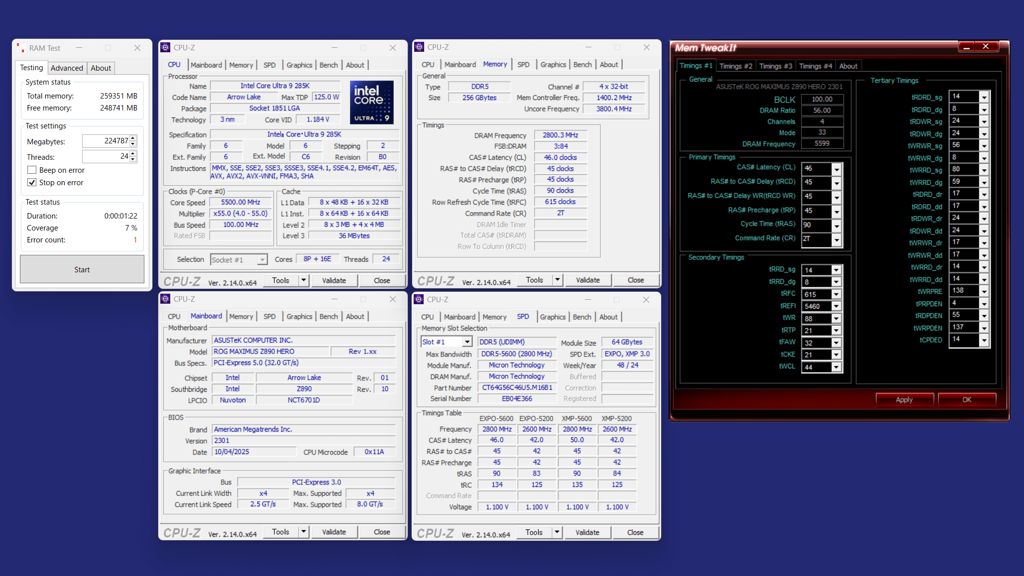 「Crucial CT2K64G56C46U5」を2キット使用した64GB×4枚組み 256GB容量の構成は、同メモリに収録されたJEDEC準拠と同等の5600MHzのOCプロファイルを適用し、IMC電圧を1.200V程度に盛るだけでCPU&マザーボードのメモリOC耐性が十分なら安定動作することを確認済みです。