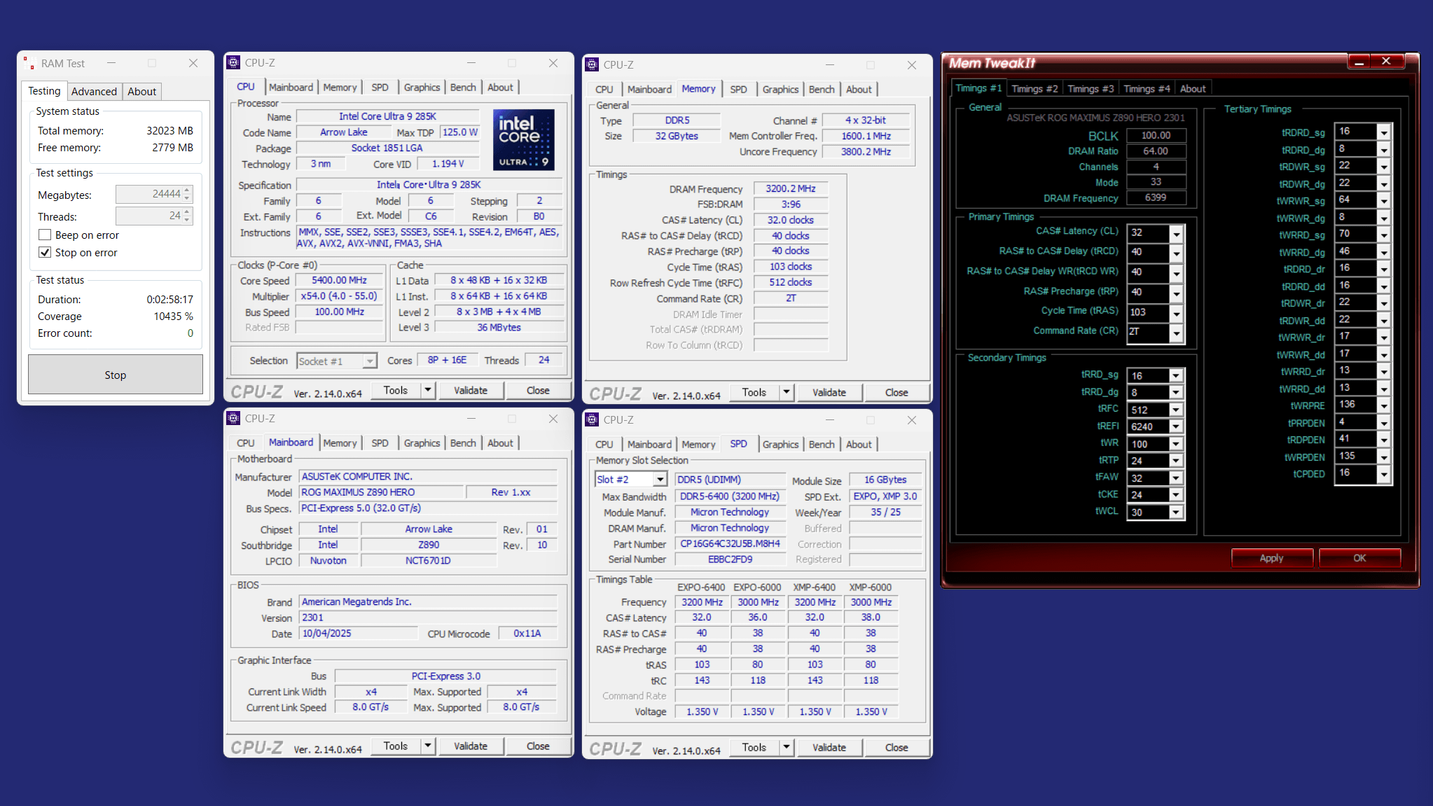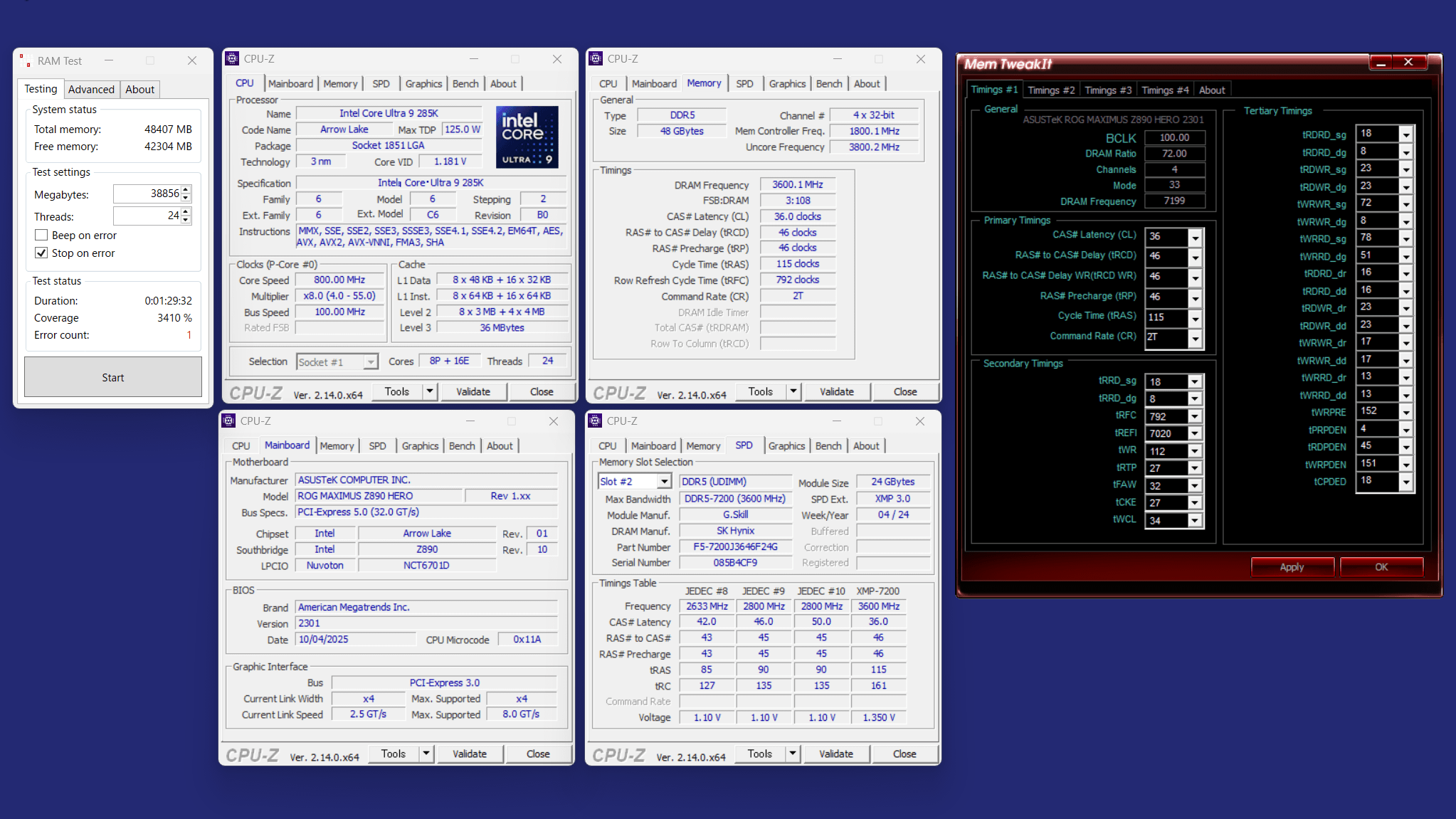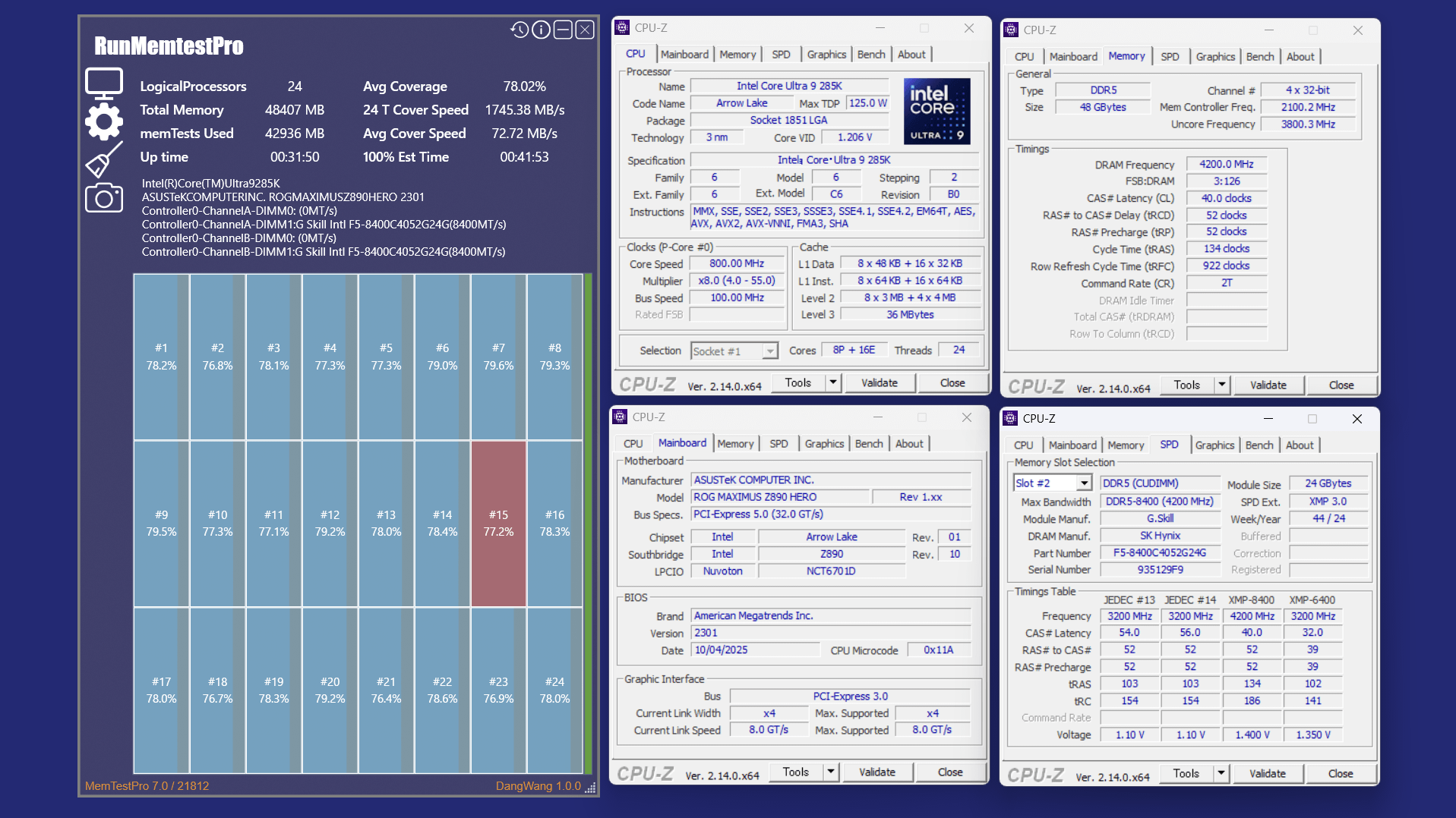 メモリOC検証に使用している8400MHz CUDIMMや7200MHz UDIMMは他社ハイエンドMBだけでなく、同社のエントリークラス製品 Z890 AYW GAMING WIFI Wでも当サイトの安定基準であるKarhu RAM Test 2時間ノーエラーで安定動作を確認していますが、「ASUS ROG MAXIMUS Z890 HERO」は数分から、長くても1時間程度でエラーになってしまいます。