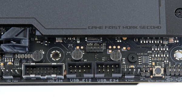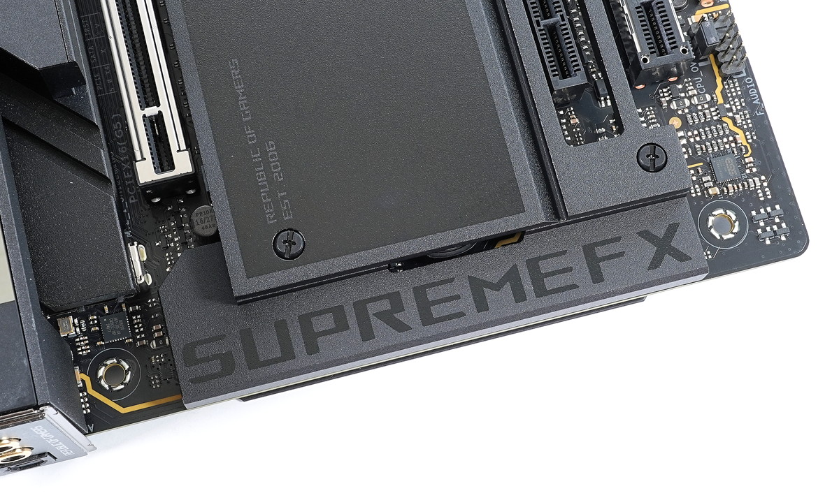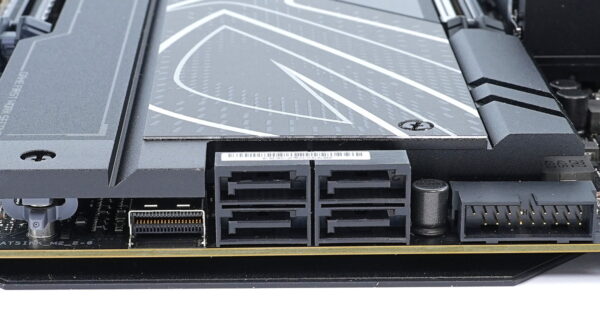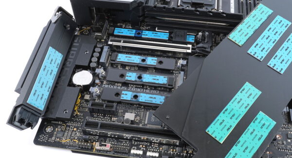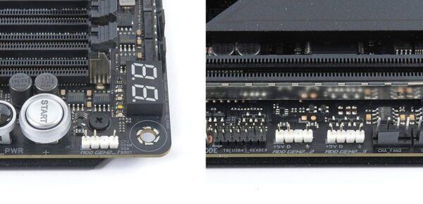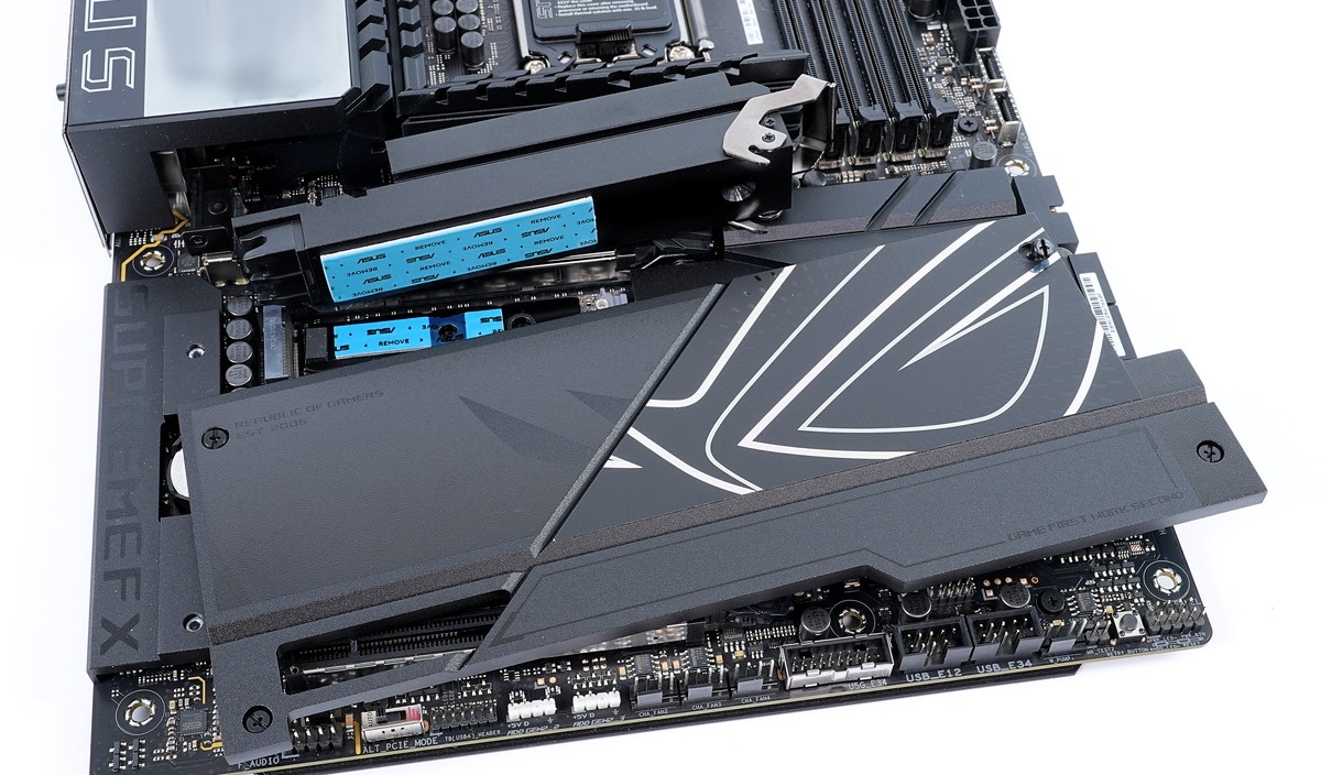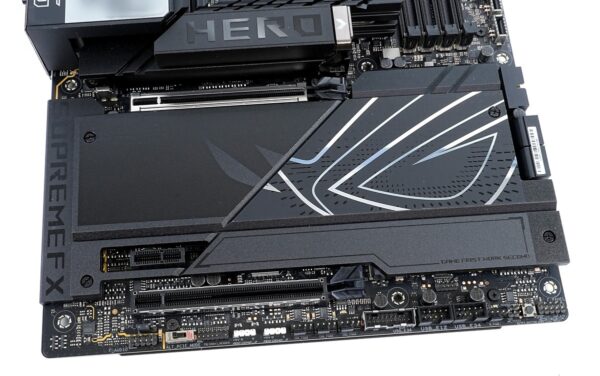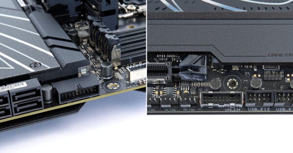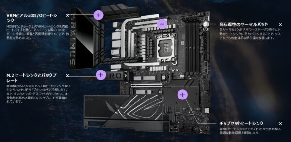 CPUソケット周りには黒色ベースの重厚なヒートシンクを搭載し、マザーボード下側はチップセットカバーとも一体化したM.2 SSDヒートシンクが表面を覆っています。
