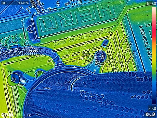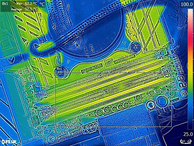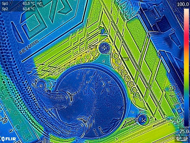 Core Ultra 9 285Kの定格動作で負荷をかけるとEPS電源経由のCPU消費電力は250W以上に達しますが、ソフトウェアモニタリングやサーモグラフィーでVRM電源周りの温度を確認したところ、60度台に収まっていました。