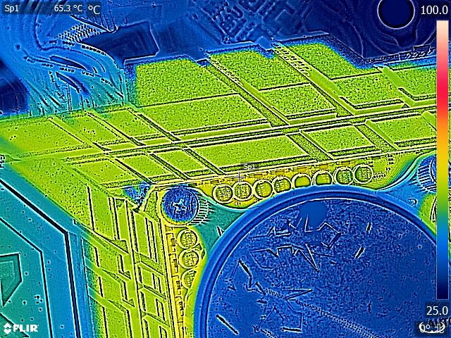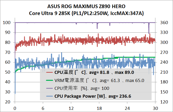 - 285Kの250W超負荷でもVRM電源温度は60度台に収まる