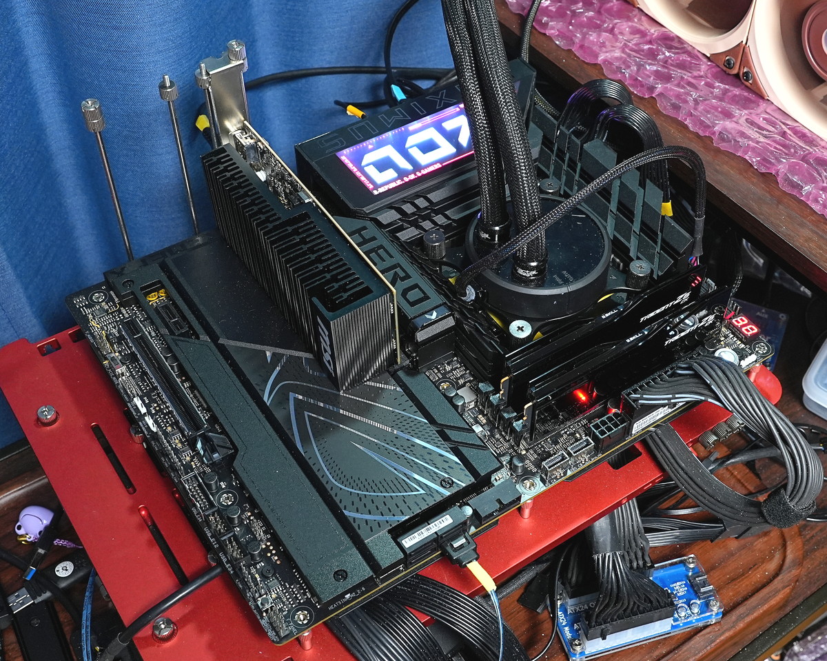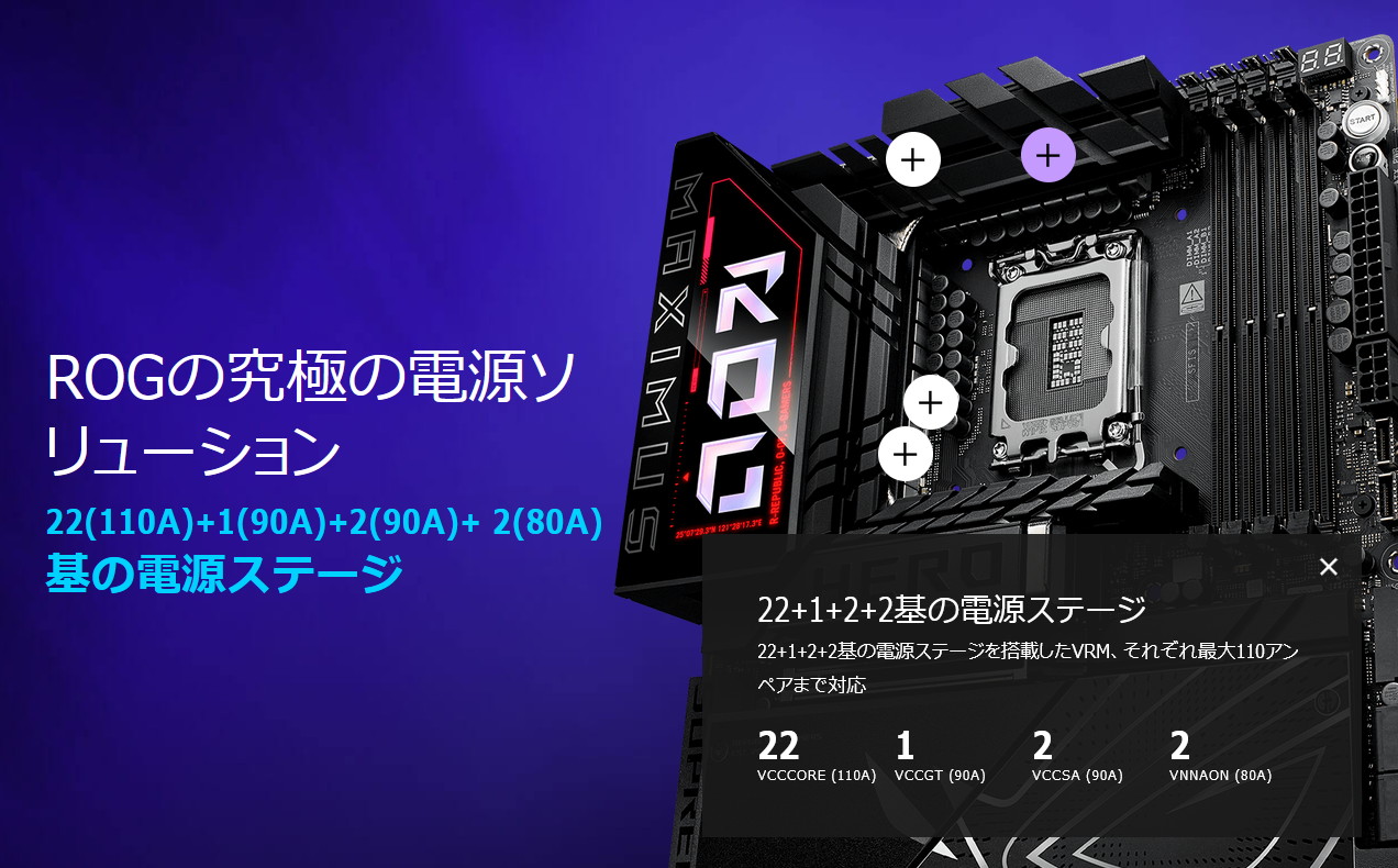 「ASUS ROG MAXIMUS Z890 HERO」はメインストリーム向けマザーボードながら、27フェーズ(22+1+2+2)の超堅牢なVRM電源回路が実装されています。