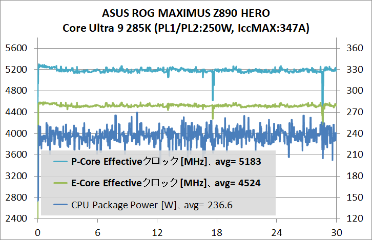 Core Ultra 9 285KはPower Delivery Profile:PerformanceでIntel公式仕様の通りに動作させた場合、電力制限はPL1/PL2:250Wですが、IccMAX:347Aの電力制限も効いてくるので、動画エンコードやCinebenchのような非常に重いマルチスレッド負荷に対してはPL1を少し下回るCPU消費電力で変化しながら推移していきます。
