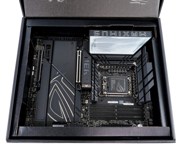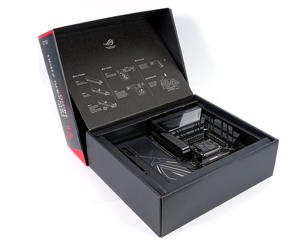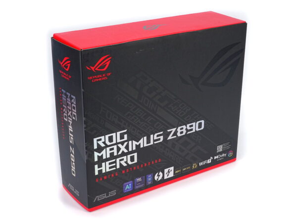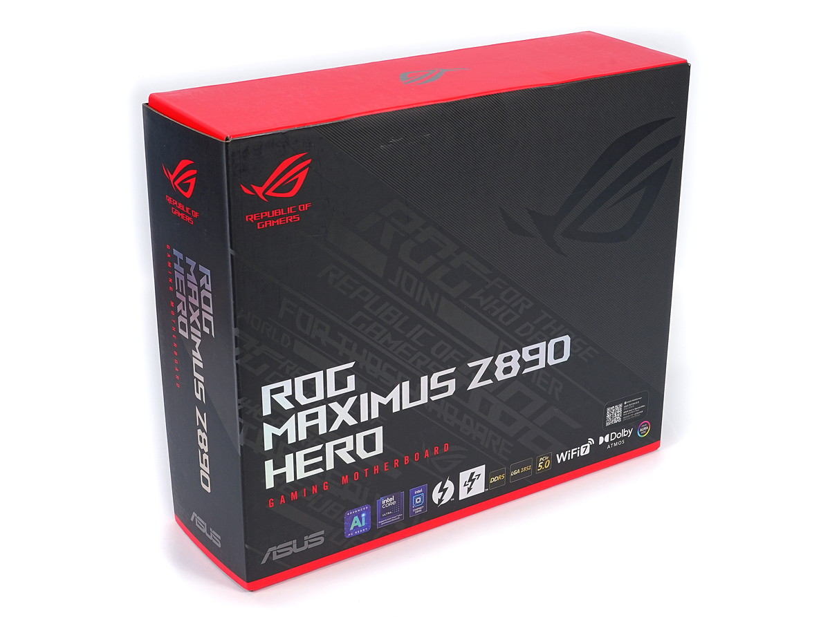 ASUS ROG MAXIMUS Z890 HEROのパッケージはマザーボードの箱としては独特な上開き化粧箱になっていました。開閉しやすく高級感もあります。