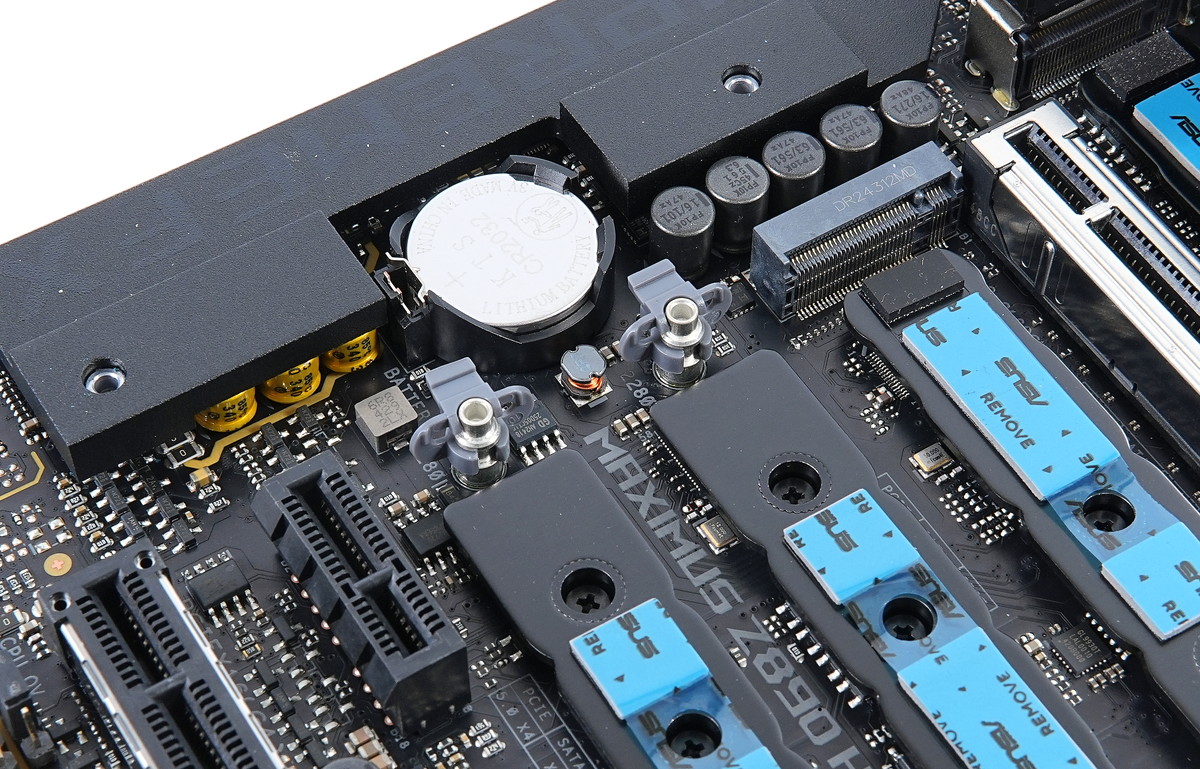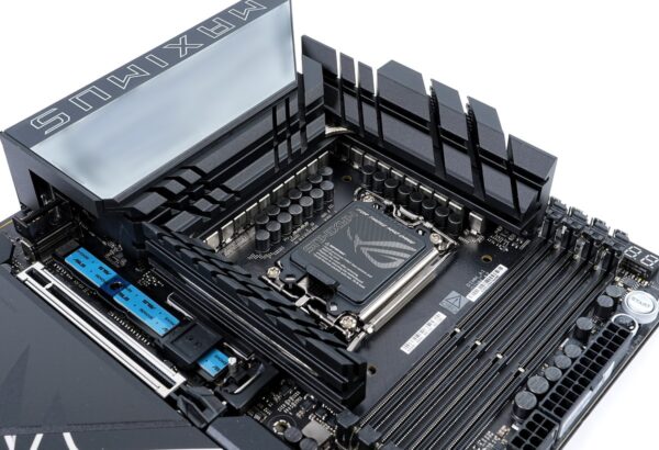 「ASUS ROG MAXIMUS Z890 HERO」にはVRM電源クーラーとしてCPUソケットの上側と左側と下側の3カ所に大型のアルミニウム製ヒートシンクがあり、3つのヒートシンクはコの字型ヒートパイプで連結されています。チョークコイルに覆い被さってCPUソケットに迫る勢いの非常に巨大なヒートシンクです。