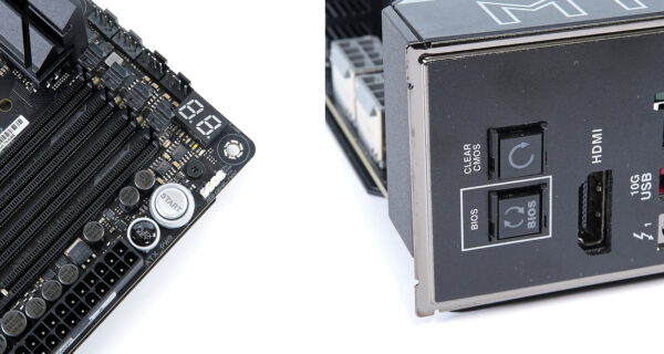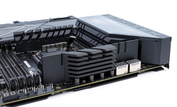 CPUソケット左側はリアI/Oカバーの天面まで伸び、モノブロック構造で超巨大なVRM電源クーラーになっています。