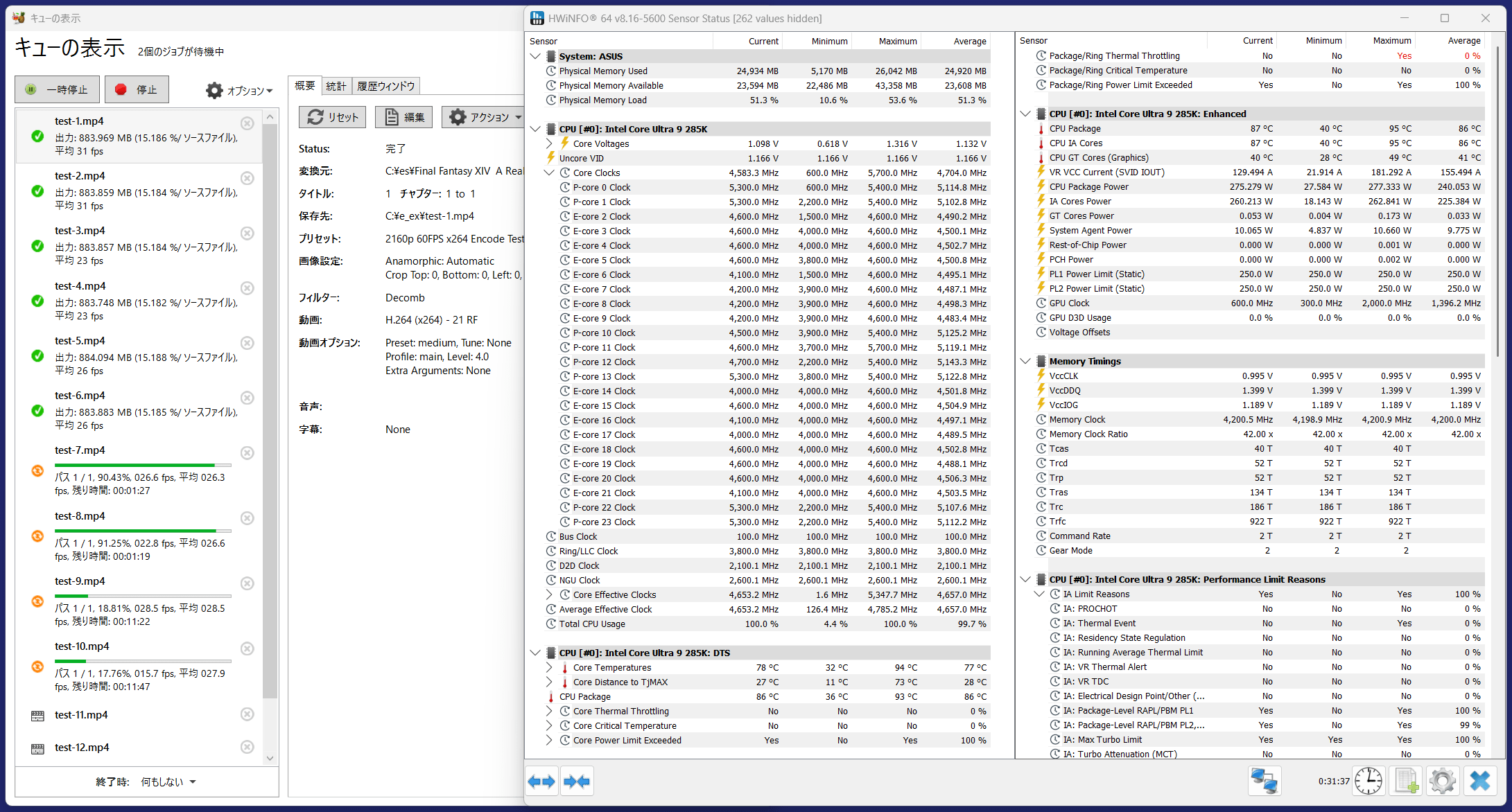 Core Ultra 9 285Kは24コア24スレッドのCPUなので、同じ動画のエンコードを4つ並列して実行し、30分程度負荷をかけ続けます。