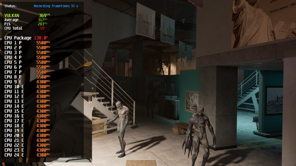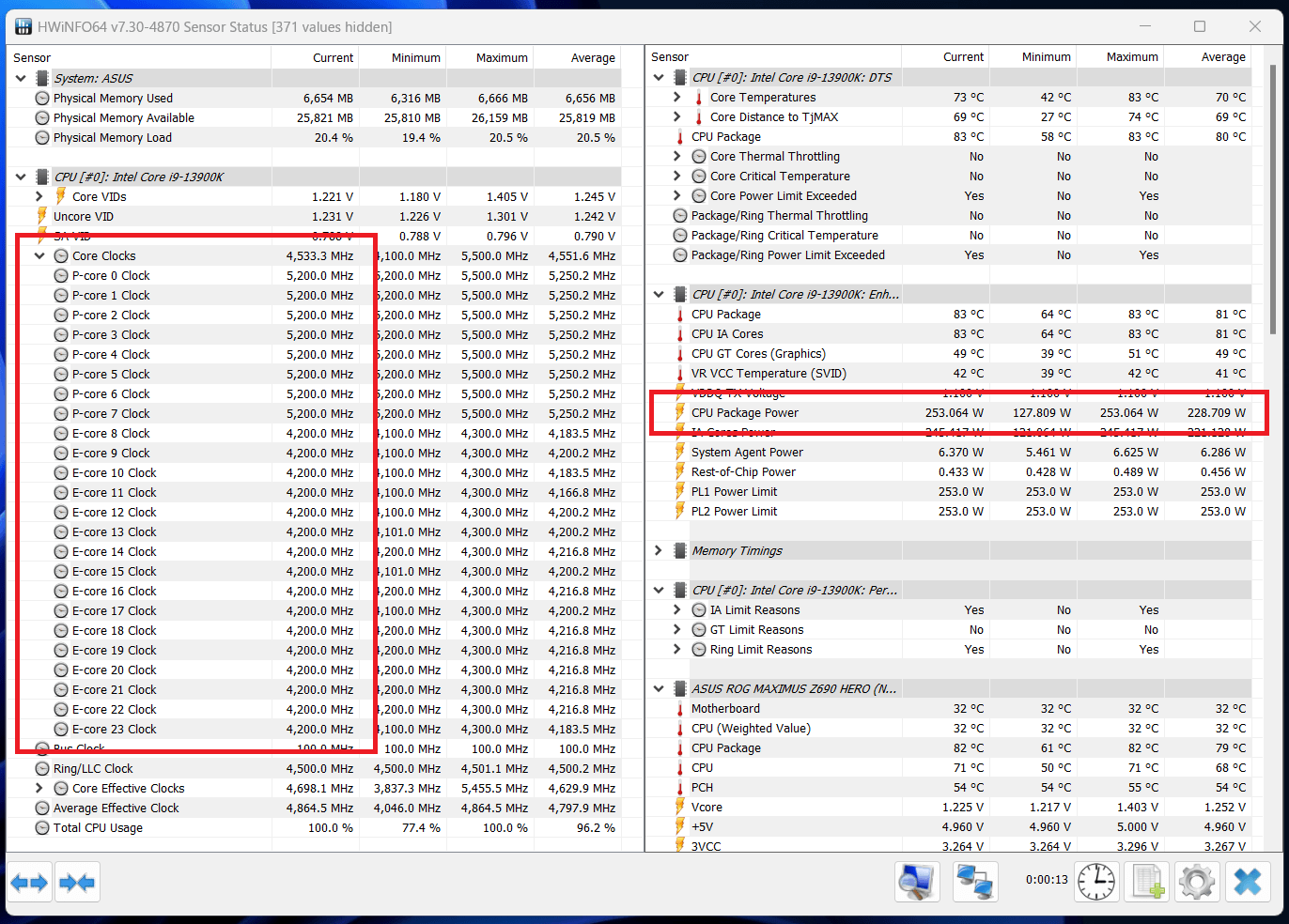 電力/電流制限が効くので動画エンコードなどのフル負荷においてCPUコアクロックが全コア最大動作倍率に張り付くことはありませんが、「ASUS ROG MAXIMUS Z890 HERO」のVRM電源温度などマザーボード原因でスロットリングが発生することはなく、Core Ultra 9 285KをP-Core All 5.2GHz、E-Core All 4.5GHz程度の実動値で安定して動作させることができました。