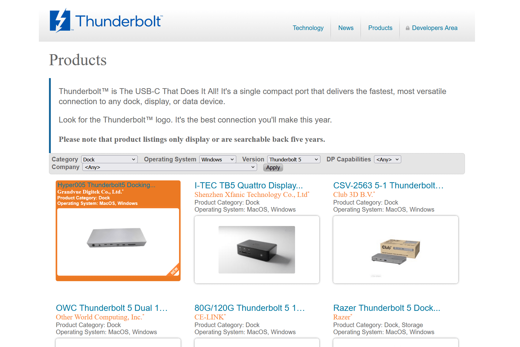 Thunderboltは正式に認証を受けた製品だけが名乗れる規格であり、認証を受けた製品は公式サイトの製品一覧に掲載されます。逆に言えば、ここに掲載されていない製品は非正規品です。