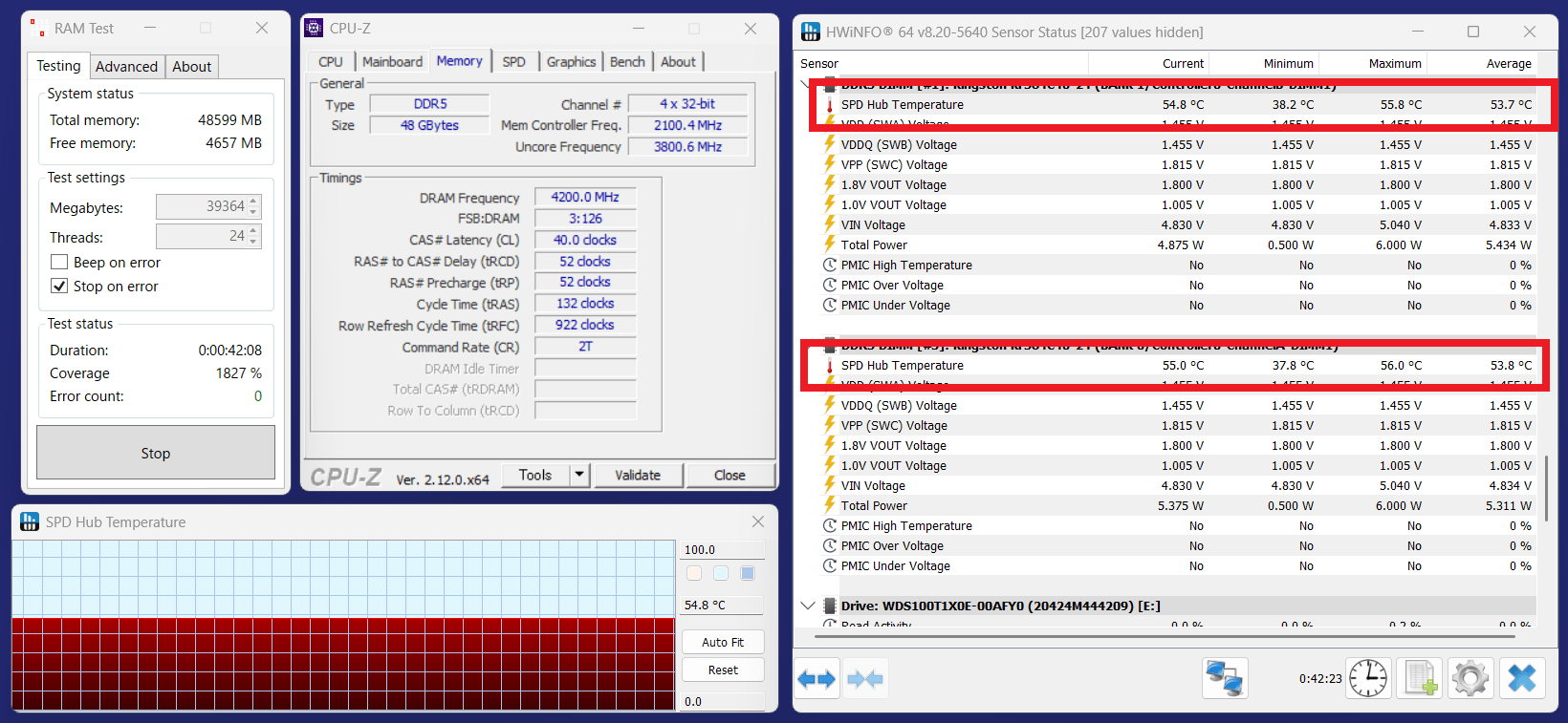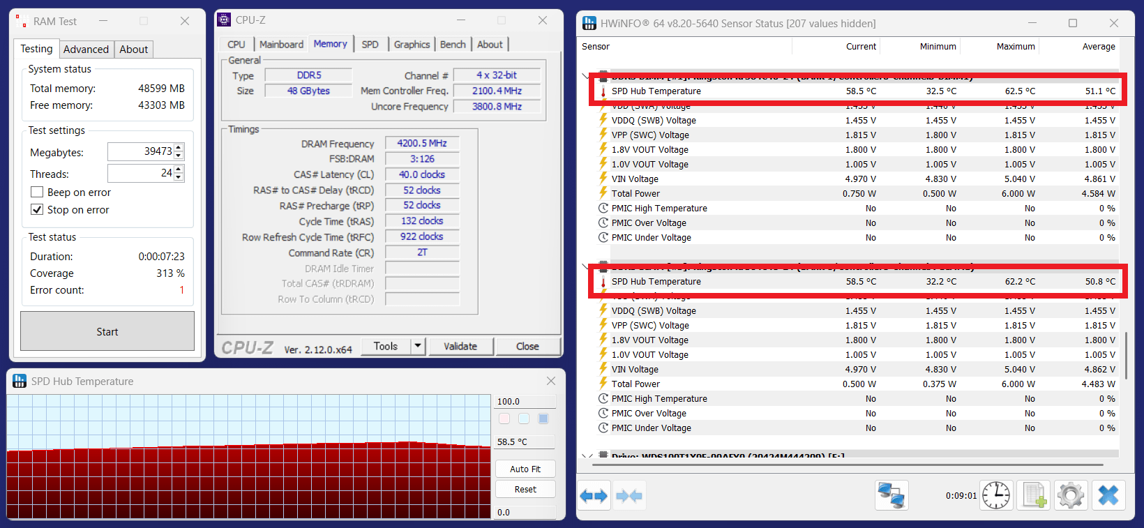 DDR5メモリにおいて6000MHz台の低レイテンシ設定や、7000~8000MHzのハイクロック設定は温度影響によるメモリエラーが結構シビアです。詳しくはメモリOCに関する解説のtREFI関連の部分を参照してください。*ゲーム用途でメモリOCを行う場合は実用的に高温になることがないので、あまり気にする必要はありませんが、動画エンコードなどシステムメモリを大量に使用するクリエイティブタスクについてはメモリ温度がメモリストレステスト的に上昇するので実用的にも対策が必要になります。