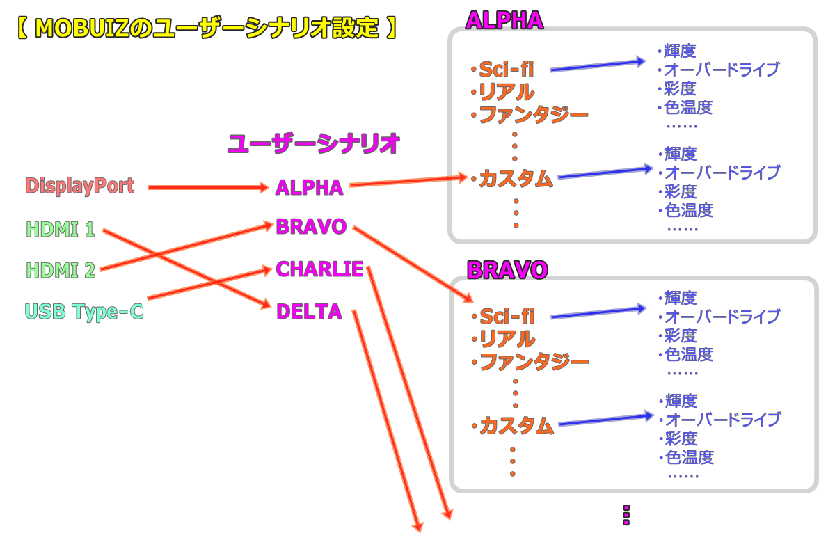 「MOBIUZ EX271UZ」にはALPHA、BRAVO、CHARLIE、DELTAという、ビデオ入力の数と同じ4つのシナリオがあります。シナリオはビデオ入力とカラーモードを繋ぐ中間プロファイルのような存在です。