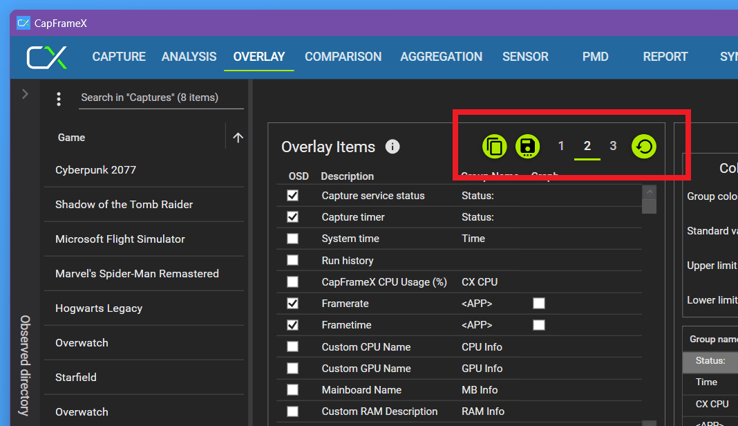 最初は役割が分かり難いかもしれませんが、CapFrameXを扱う上で必須となる項目は『Capture』『Analysis』『Overlay』『Sensor』の4つです。