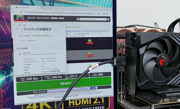 DisplayPort2.1(DP80)によって映像伝送を行うモニタは未発売ですが、ケーブルには後方互換性もあるので4K/240Hz対応ゲーミングモニタ Alienware AW3225QFで動作を確認してみました