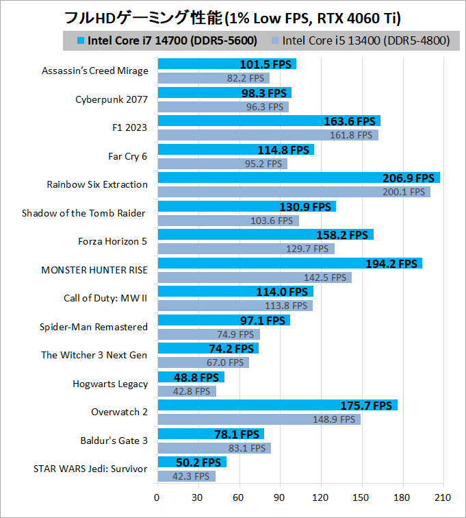 RTX 4060 Tiにグラフィックボードを揃えて、Core i7 14700とCore i5 13400を比較するとフルHD・ハイフレームレートではCPUボトルネックによって平均FPSと最小FPS(1% Low FPS)の両方で10%以上も性能差があります。