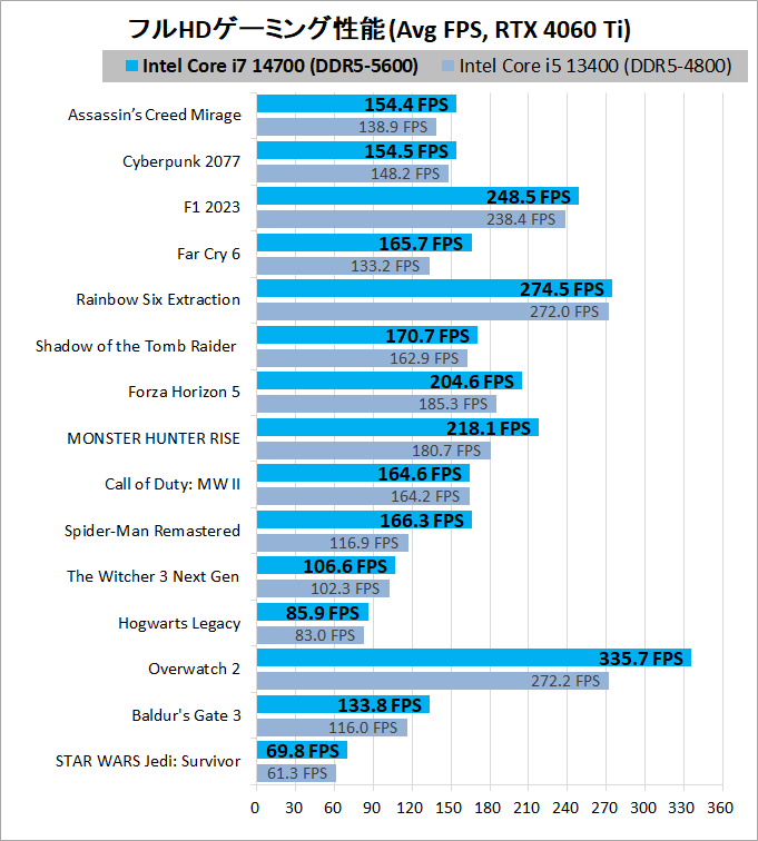 冒頭でも述べた通り、グラフィックボードをGeForce RTX 4060 Tiに統一して、Core i7 14700とCore i5 13400のCPUボトルネック(ゲーム性能)を比較していきます。