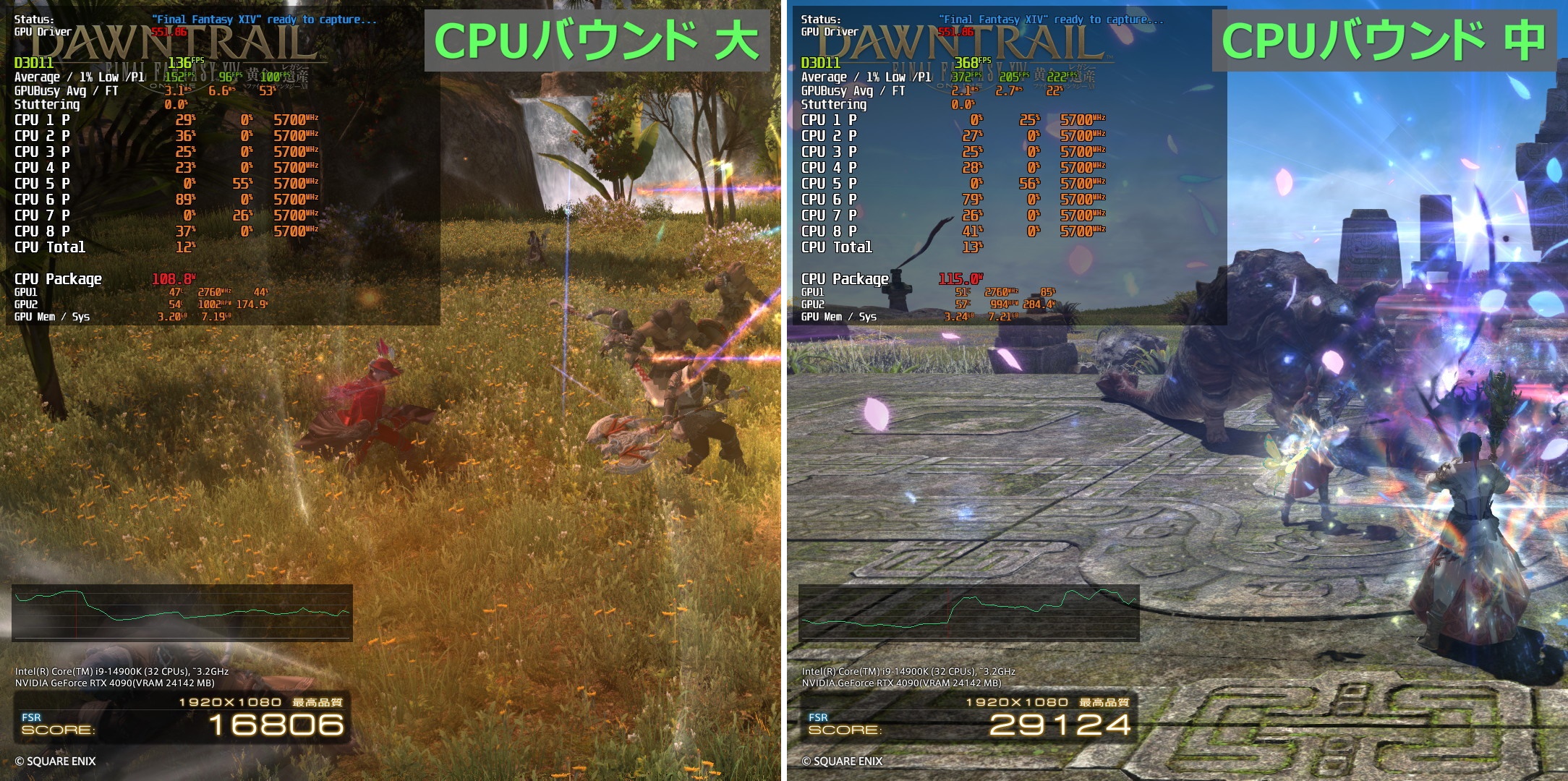 先日公開されたファイナルファンタジーXIV 黄金のレガシーのベンチマークソフトは5種類のテストシーンで構成されていますが、中盤の多数キャラが表示されるマップ戦闘シーンはCore i9 14900K&DDR5-5600の環境で150FPS程度と非常にCPUバウンドであるのに対して、序盤や後半はGPU性能に応じて300~600FPSにフレームレートが伸びます。
