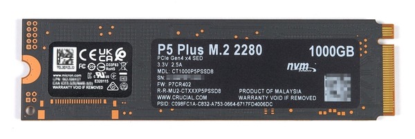「Crucial P5 Plus SSD」は今回レビューする1TBモデルだけでなく、最大容量の2TBモデルを含め、全容量モデルが背面には素子実装のない片面実装です。