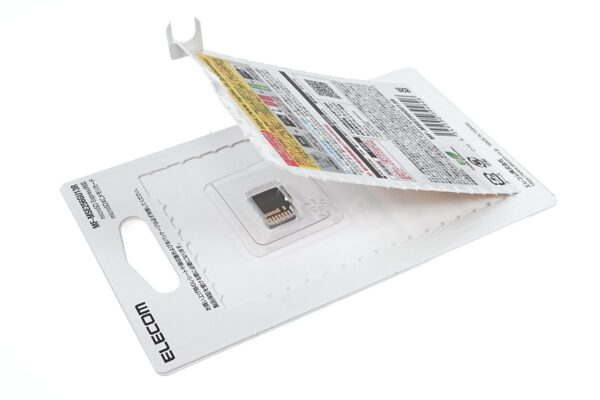 「エレコム SD Express対応microSDカード」は薄い紙製パッケージで梱包されています。背面に切り欠け線があるので、ハサミは必要なく、それに沿って破くだけで簡単に開封できます。
