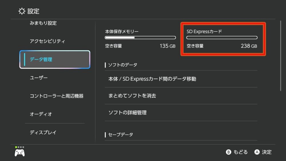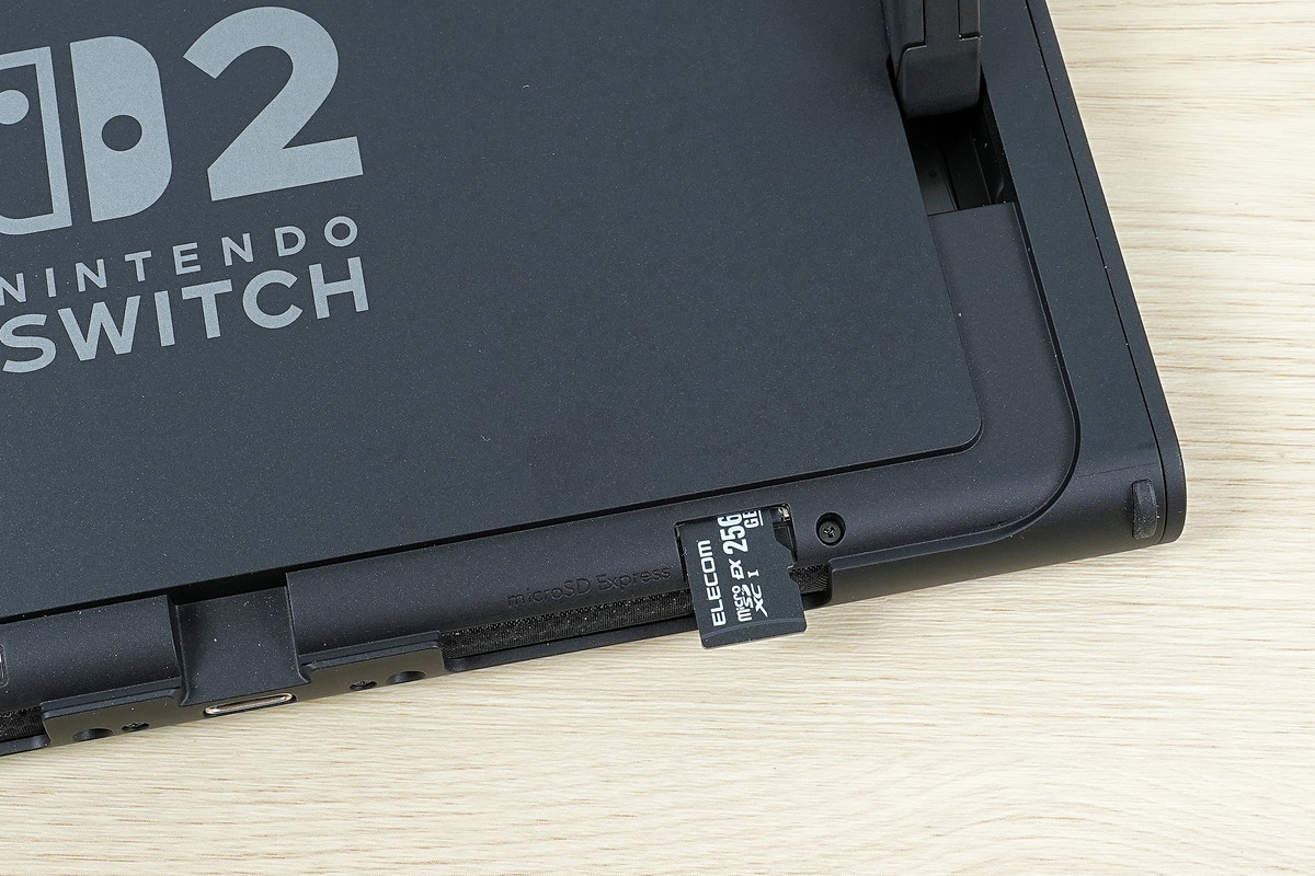 一番高速なSwitch 2の本体保存メモリーは、よく遊ぶゲームの保存先に使用したいので、画像・動画データやゲームバックアップで容量を圧迫されなくなるのは、SD Expressカードで保存領域を拡張するメリットです。