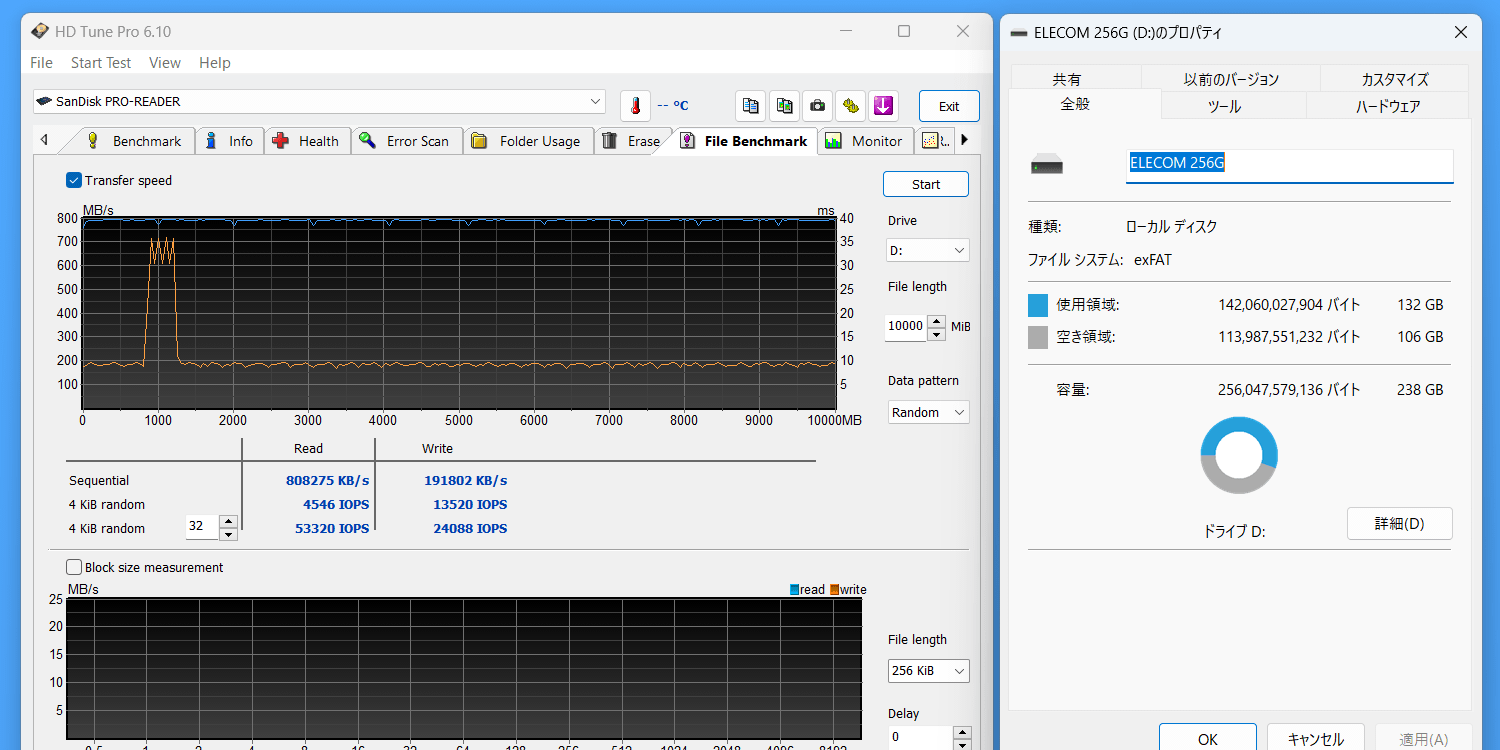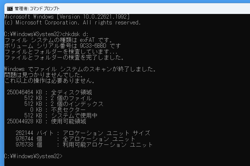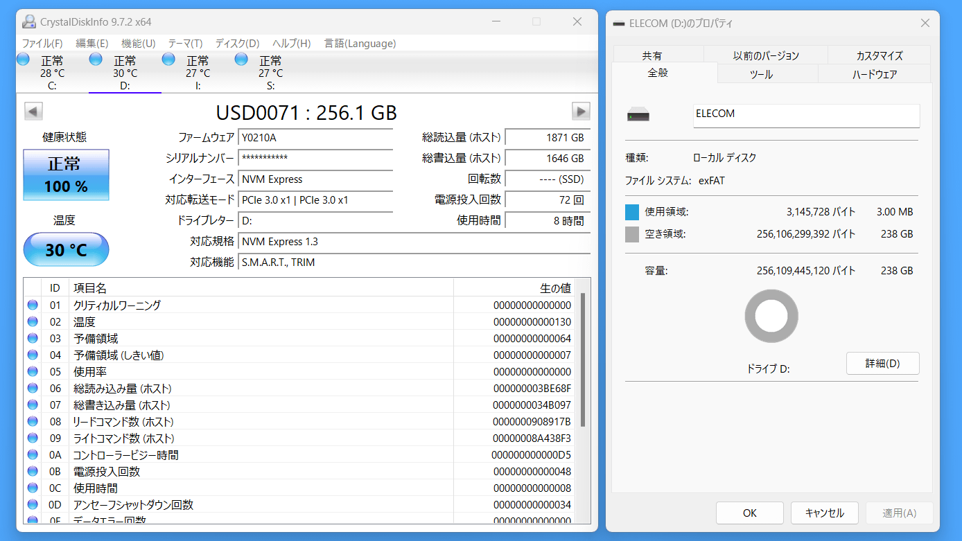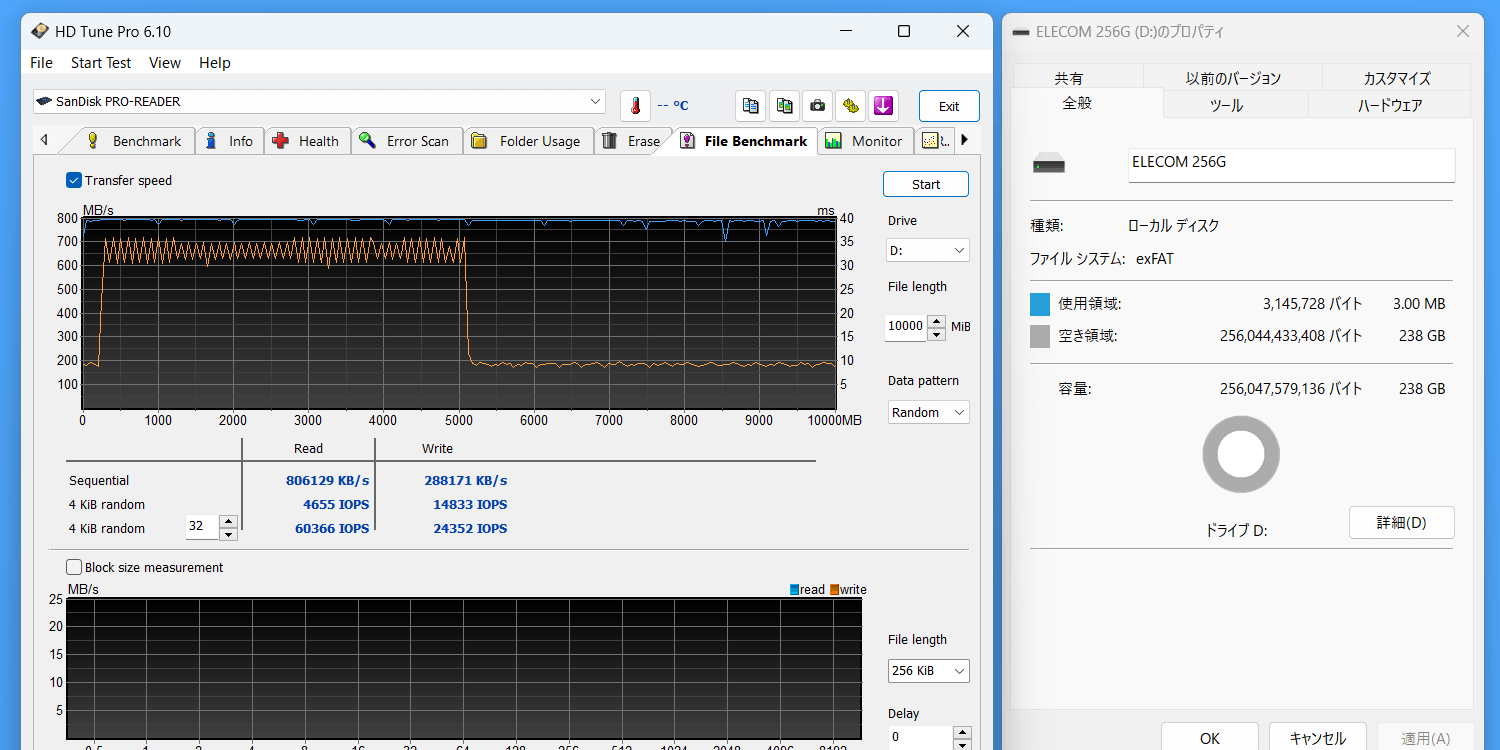 「エレコム MF-MSE256GU13R」のexFATボリュームをWindows 11上で作成したところ、空き容量は238GBでした。