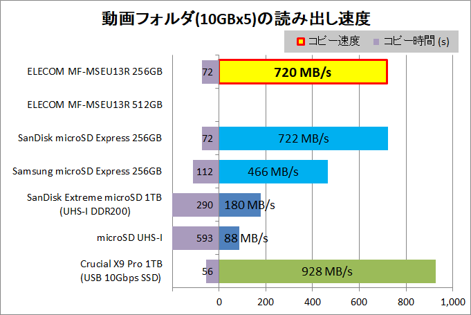 SD Expressメモリーカードリーダーを組み合わせれば、UHS-I規格のSDメモリーカード環境と比較して、「エレコム SD Express対応microSDカード MF-MSEU13Rシリーズ」は8倍も高速に動画や写真のデータをPCへ転送できます。