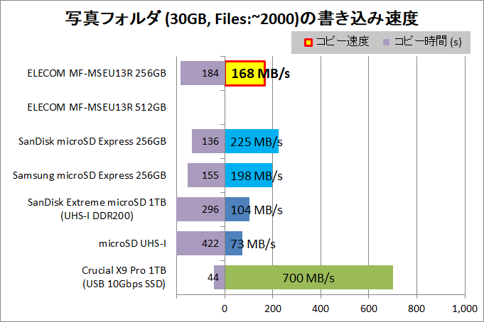 またSD Expressカードから本体保存メモリーへのコピー速度は100MB/s程度、本体保存メモリーからSD Expressカードへのコピー速度は70MB/s程度が上限です。