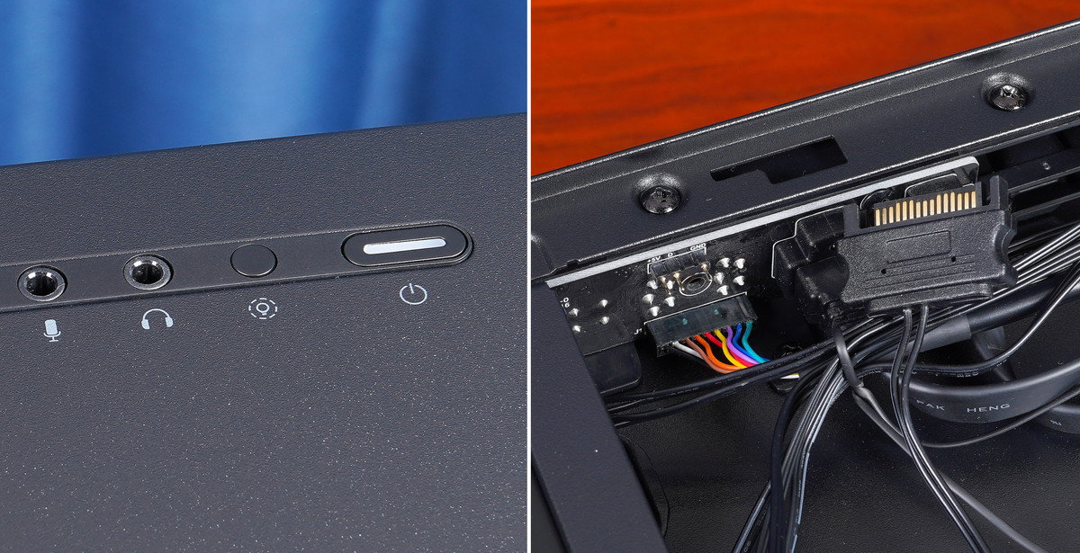 手前(下写真では右)から順にパワースイッチ、リセットスイッチ(RGB版の場合はLEDスイッチ)、ヘッドホン出力3.5mmジャック、マイク入力3.5mmジャック、USB3.0 Type-A×2が実装されています。USB3.0 Type-Aの隣にはUSB Type-C用の空きポートが用意されています。