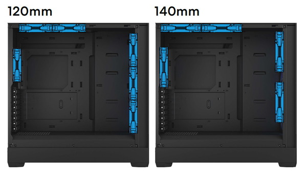 「Fractal Design Pop XL」はフロントに120mm×3 or 140mm×2、トップに120mm×2 or 140mm×2、リアに120mm×1 or 140mm×1のケースファンを設置できます。
