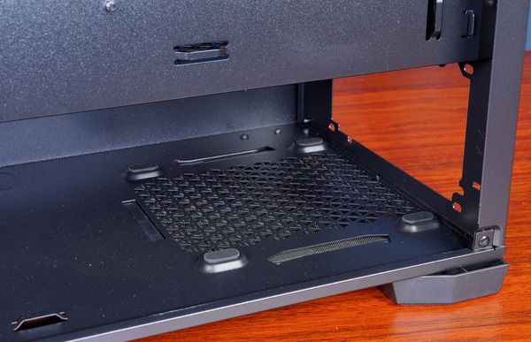 ケース内部の電源ユニット設置スペースに注目してみると、吸気スリットの両サイドには電源ユニットの安定した固定と電源ユニット冷却ファンの振動によるPCケースとの共振を防止するためゴム足がスタンドとして設置されています。