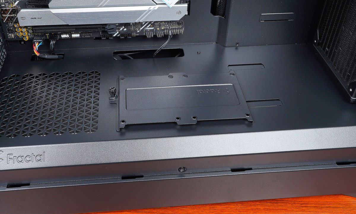 この2.5インチストレージトレイはPSUカバー上にも設置可能です。「SSD bracket kit – Type D, Black(型番:FD-A-BRKT-004)」の名前で増設アクセサリとして販売されているので、追加購入することでマザーボードトレイ裏とPSUカバー上の2カ所を同時に使用できます。