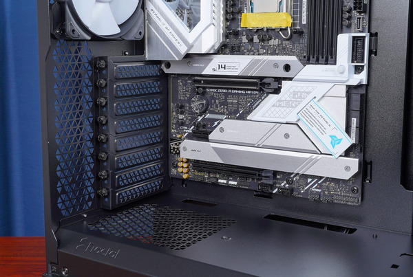 Fractal Design Pop XL Air RGBのマザーボードトレイには標準でATXに合わせたスペーサーが装着されています。PCIEスロット数はATXフォームファクタに合わせて8段が設置されています。