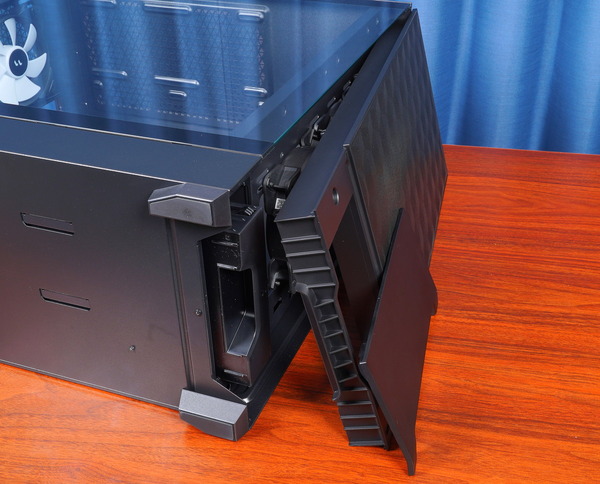 裏配線側サイドパネルは下側ヒンジになる構造なので、下側を引っ掛けさえすれば、着脱時にパネルを落とす心配はなく、一定角度以上に外へ倒れることもありません。