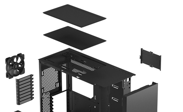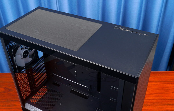 天面にはシャーシに直接ファンマウントがあり、正六角形を構成する三角形の穴で天面に広くエアスリットが設けられています。ネジ穴スリットは外側の1列を基準に、マザーボード側の2列でそれぞれ120mm幅と140mm幅に対応します。