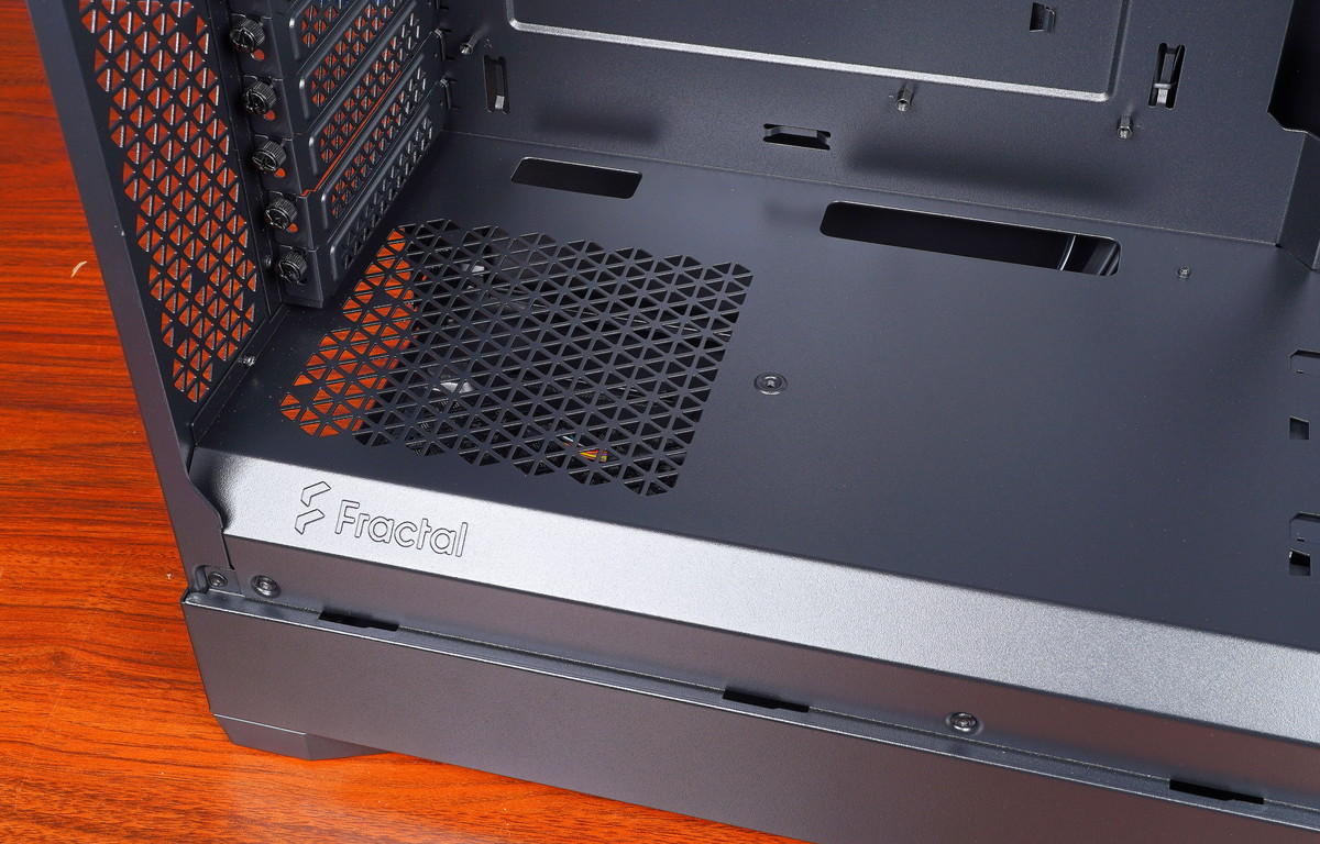 「Fractal Design Pop XL Air RGB」のPCケースボトムを見ると、電源ユニット部分にはエアスリットがあるものの、それ以外はスチール板で塞がっており、シンプルな形状です。