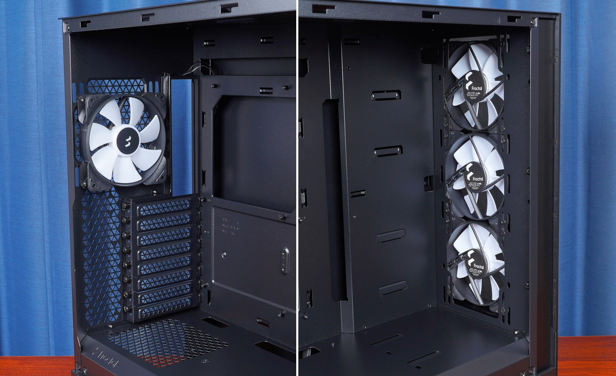 「Fractal Design Pop XL Air RGB」のPCケース内部にはフロントに3基の120mm角、リアに1基の120mm角で計4基のケースファンが標準で搭載されています。