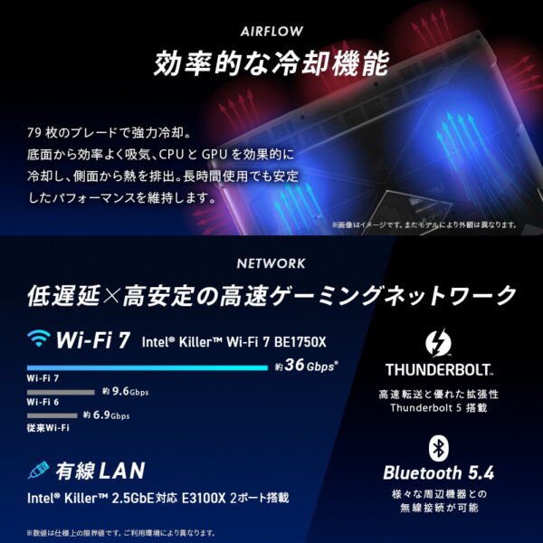 ネットワーク関連では2.5Gb有線LANに加えて、最新規格 Wi-Fi 7に対応した無線LAN(Intel BE200)を標準搭載しています。