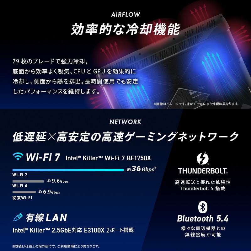 接続規格としてはWi-Fi 802.11 a/b/g/n/ac/ax、2.4/5GHz/6GHzトリプルバンド、最大通信速度5800Mbps、Bluetooth 5.4に対応しています。
