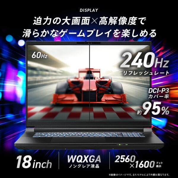 「GALLERIA NMC9L-R59-G8」は、16:10アスペクト比WQHDよりも少し縦に長い2560×1600のWQXGA解像度で18.0インチの大型サイズ液晶ディスプレイが採用されています。