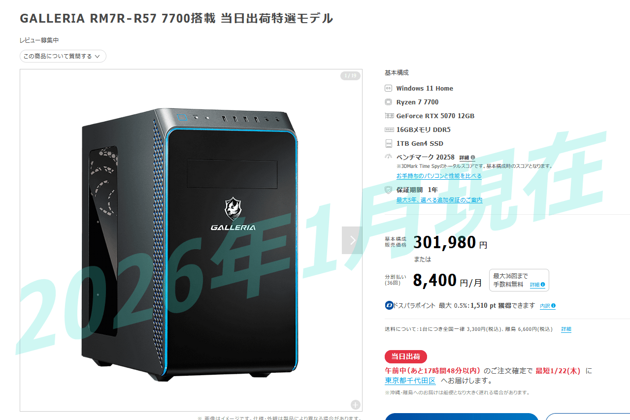さらに「GALLERIA RM7R-R57 7700搭載 当日出荷特選モデル」など一部モデルは注文当日の出荷にも対応しています。