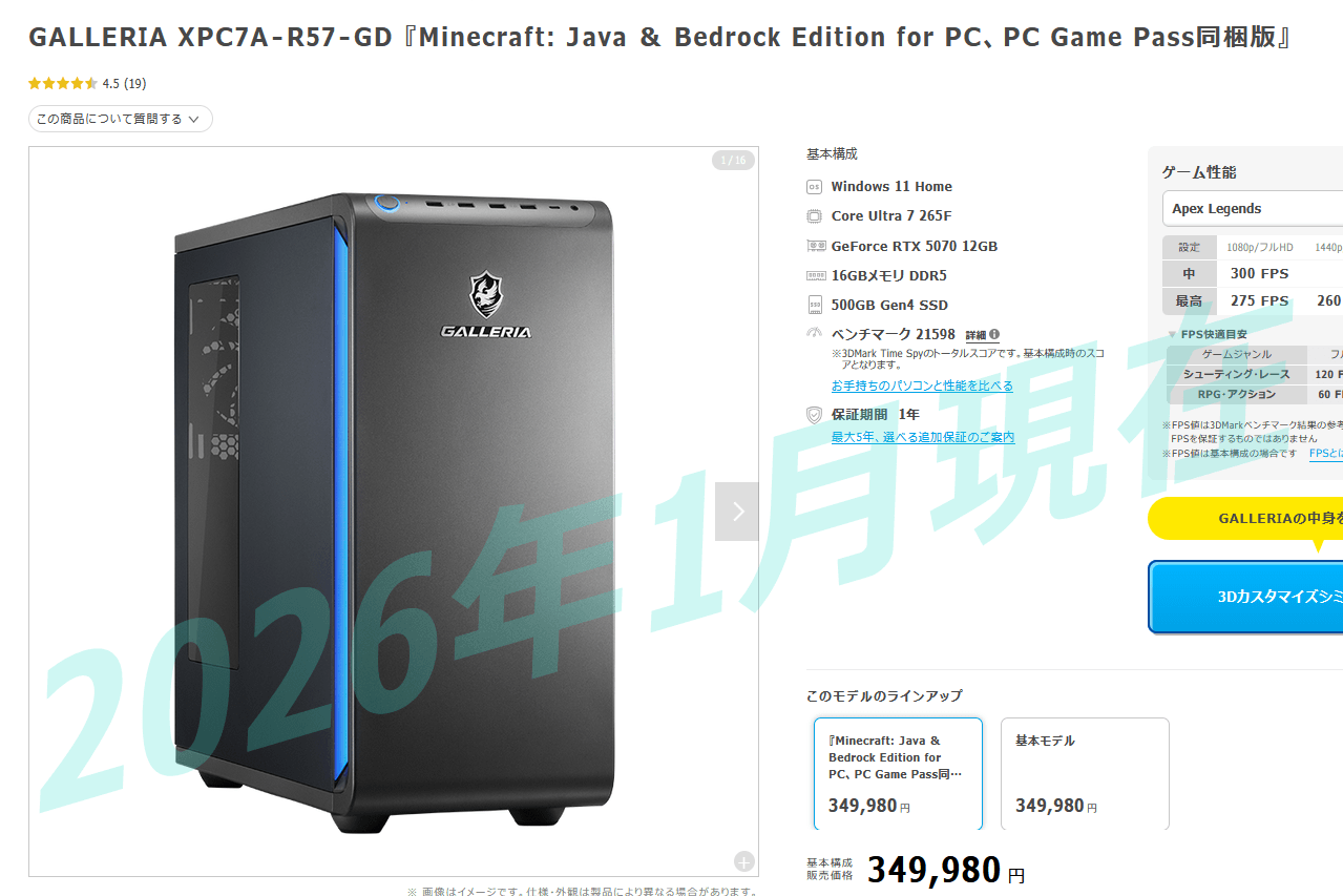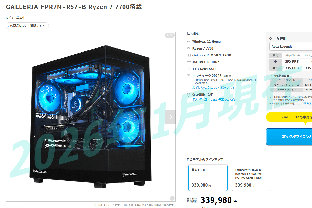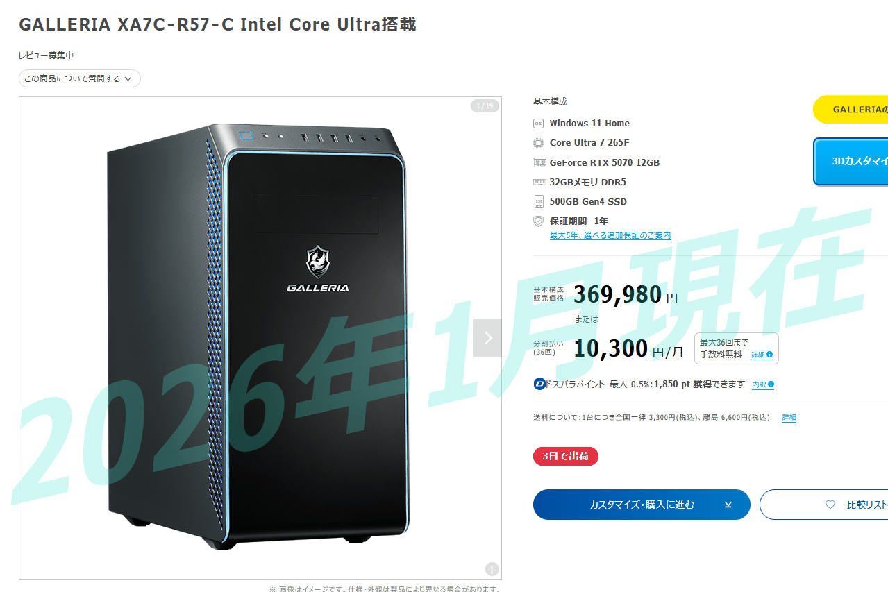 同じGPUでCPUがIntel製 Core Ultra 7 265Fの「GALLERIA XA7C-R57-C Intel Core Ultra搭載」とかもお好みで選んでOKです。
