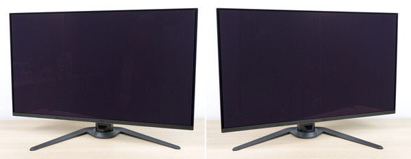「AORUS FO32U2P」の付属モニタスタンドは左右スイーベルに対応し、可動域は左右20度(40度)です。