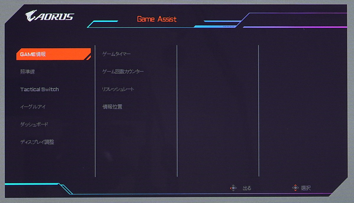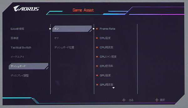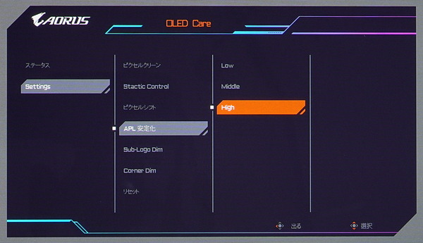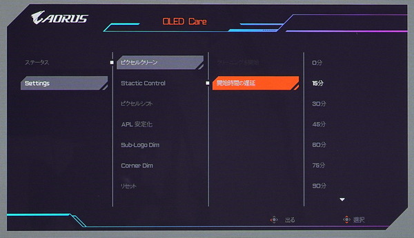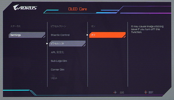 メインメニュー表示中にコントロールスティックを上左右に操作すると、OSD詳細設定、OLEDケア、ゲームアシストの設定ウィンドウに切り替わります。