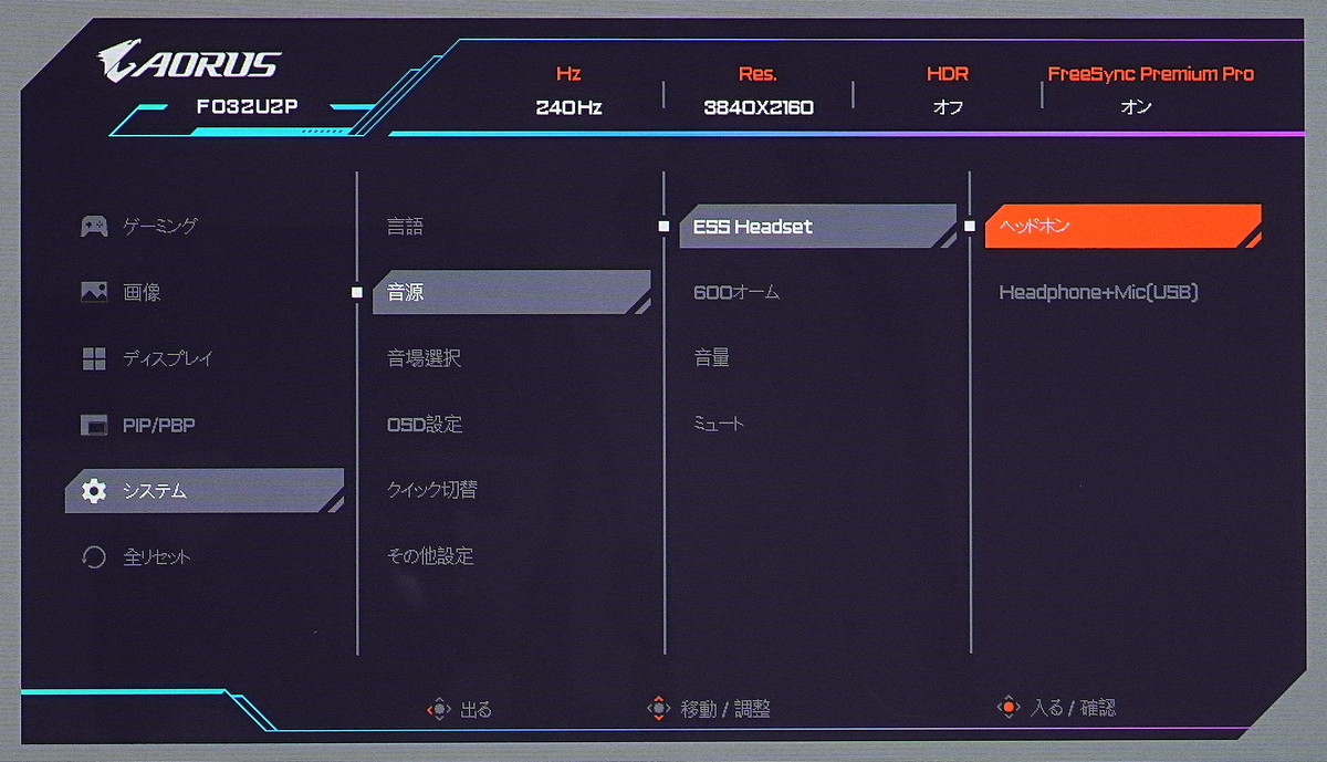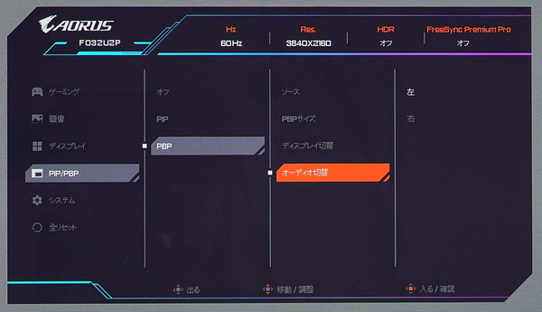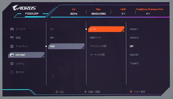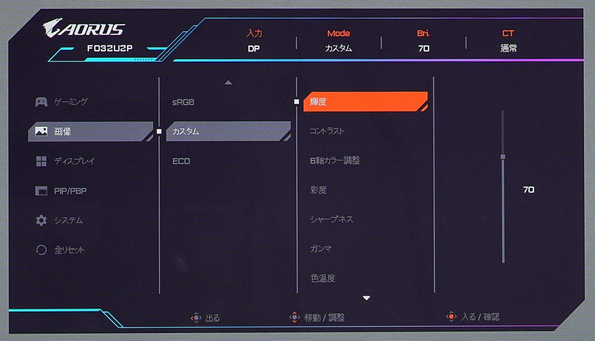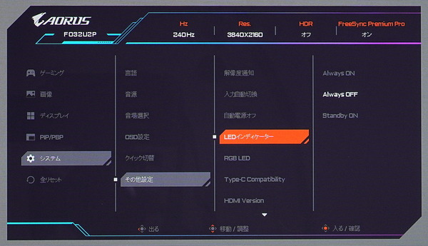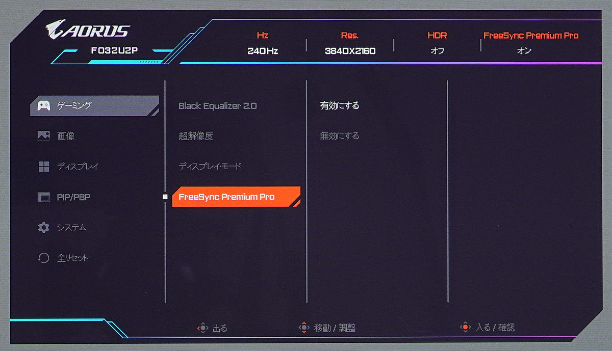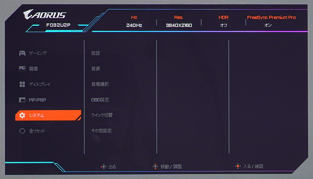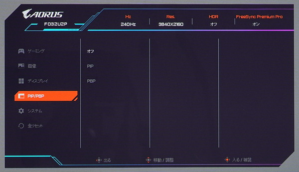 「AORUS FO32U2P」のOSDメニューには大きく分けて、「ゲーミング」「画像」「ディスプレイ」「PIP/PBP」「システム」の5種の項目が用意されています。