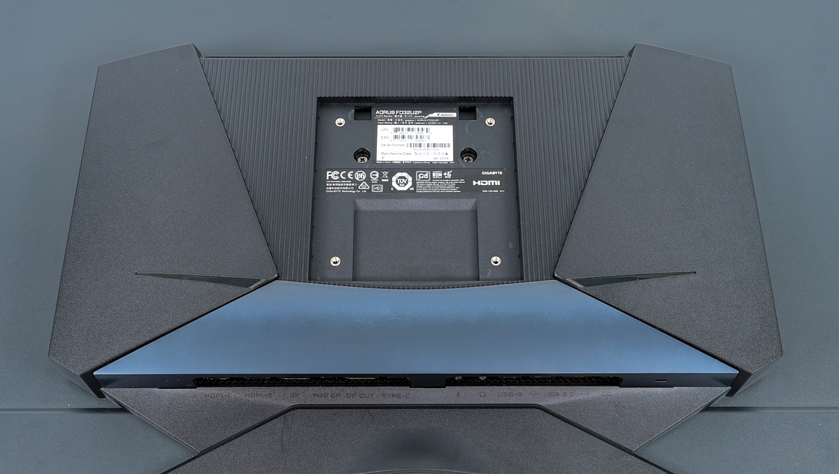 「AORUS FO32U2P」の背面に注目するとモニタスタンドの付け根がある台形状の中央部にはゲーミングモニタらしいシャープなデザインの外装カバーが装着されています。モニタスタンドのデザインとも調和がとれていて総合的にスマートな外観です。