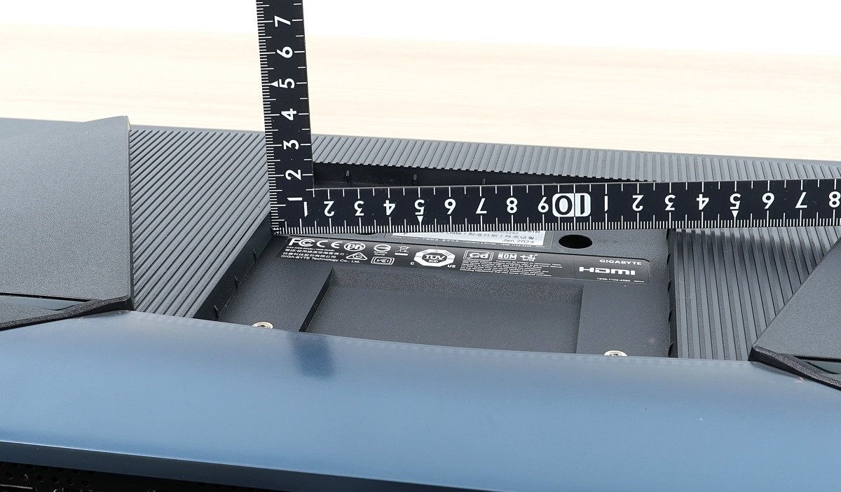 「AORUS FO32U2P」のモニタ背面の中央は一般的な液晶モニタ同様に60mm程度の厚みがありますが、有機ELテレビと同様に、金属プレート外装だけでパネル自体がほぼ剥き出しになっている外周部は厚み数mmと非常にスリムです。